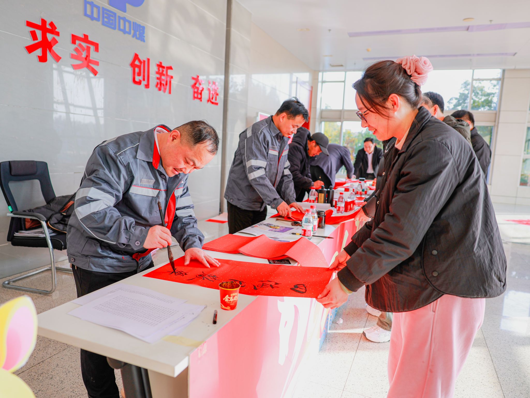活动现场暖意融融、墨香扑鼻,大红宣纸整齐铺展,笔墨砚台一应俱全,处处洋溢着喜庆祥和的节日氛围。书法协会的爱好者们凝神聚气、挥毫泼墨,笔锋流转间,一幅幅笔力遒劲、对仗工整的春联跃然纸上,一个个饱满厚重、寓意吉祥的“福”字鲜活灵动。春联内容既有“平安生产年年好,幸福生活步步高”的美好期许,也有“骏马奔腾启新程,实干兴矿谱华章”的奋进祝愿,兼顾了吉祥寓意与矿区特色,将对新年的期盼、对企业的祝福、对职工的关爱凝于笔尖。职工们纷纷驻足围观,有的主动上前协助展纸、晾放春联,有的在一幅幅墨宝前仔细挑选、轻声品评,遇到心仪的作品便欣然等候,脸上满是期待与喜悦,欢声笑语间,墨香与年味交织成最动人的冬日图景。