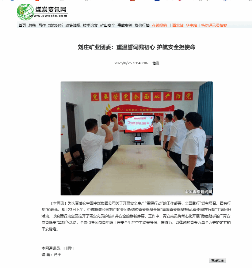 8月18日下午,中煤新集公司刘庄矿业团委组织青安岗员开展“重温青安岗员誓词·青安岗在行动”主题团日活动,以实际行动全面拉开了青安岗员护航矿井安全的崭新序幕。活动中,青安岗员将常态化开展“隐患随手拍”“青安岗查隐患”等特色活动,全面引导团员青年职工在安全生产中主动亮身份、展作为,以蓬勃的青春力量全力守护矿井的平安稳定。