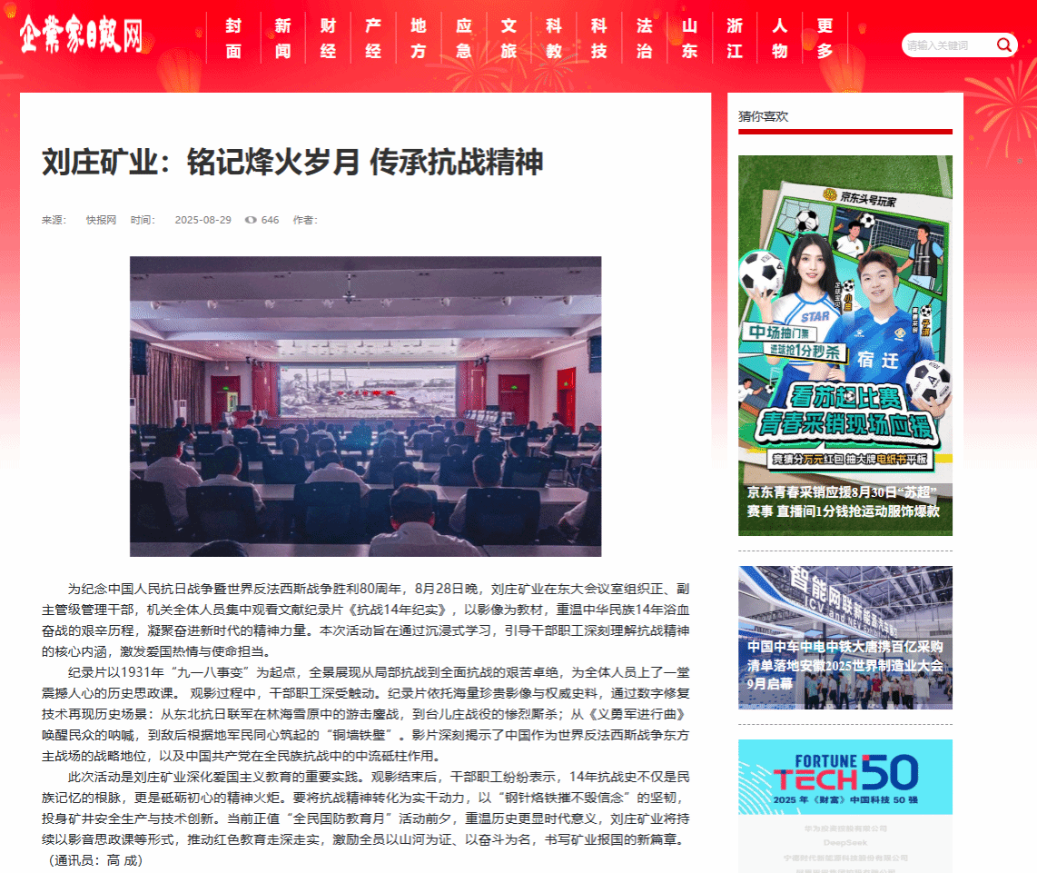 为纪念中国人民抗日战争暨世界反法西斯战争胜利80周年,8月28日晚,刘庄矿业在东大会议室组织正、副主管级管理干部,机关全体人员集中观看文献纪录片《抗战14年纪实》,以影像为教材,重温中华民族14年浴血奋战的艰辛历程,凝聚奋进新时代的精神力量。本次活动旨在通过沉浸式学习,引导干部职工深刻理解抗战精神的核心内涵,激发爱国热情与使命担当。