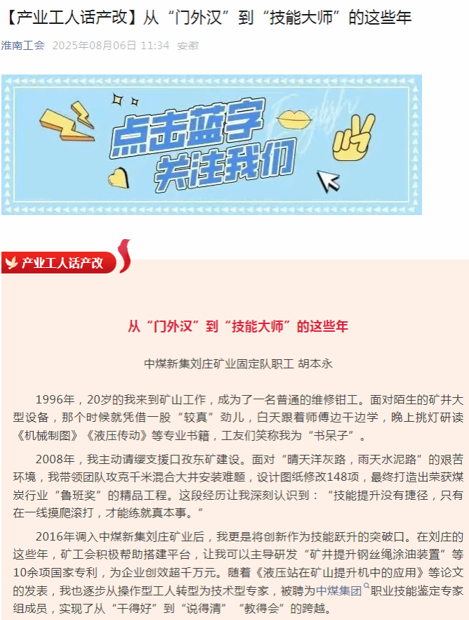 2016年调入中煤新集刘庄矿业后,我更是将创新作为技能跃升的突破口。在刘庄的这些年,矿工会积极帮助搭建平台,让我可以主导研发“矿井提升钢丝绳涂油装置”等10余项国家专利,为企业创效超千万元。随着《液压站在矿山提升机中的应用》等论文的发表,我也逐步从操作型工人转型为技术型专家,被聘为中煤集团职业技能鉴定专家组成员,实现了从“干得好”到“说得清”“教得会”的跨越。
