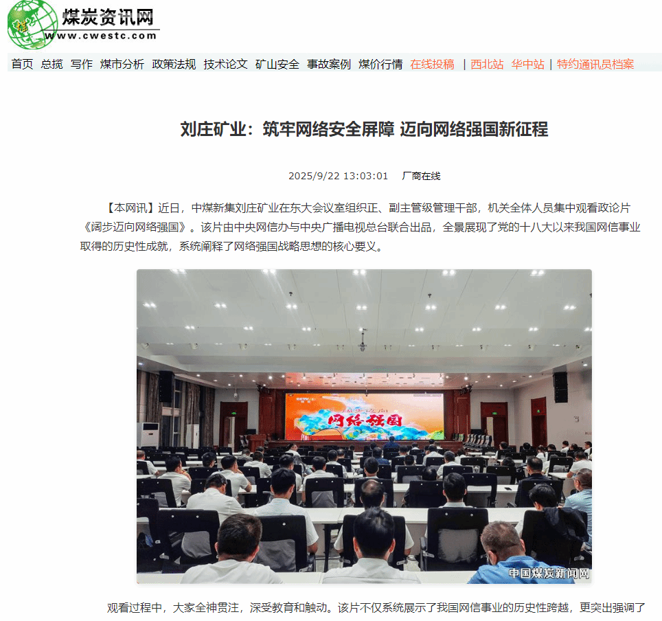 近日,中煤新集刘庄矿业在东大会议室组织正、副主管级管理干部,机关全体人员集中观看政论片《阔步迈向网络强国》。该片由中央网信办与中央广播电视总台联合出品,全景展现了党的十八大以来我国网信事业取得的历史性成就,系统阐释了网络强国战略思想的核心要义。