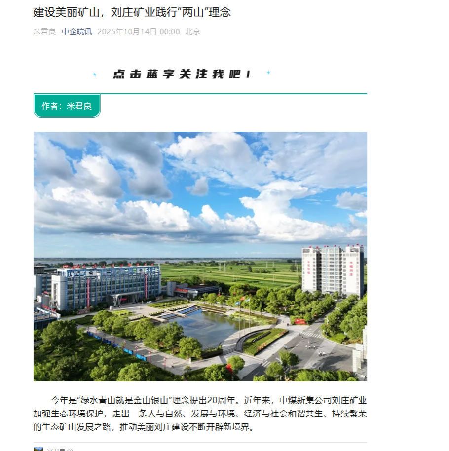 绿色是大自然的颜色,是希望的象征,更是对未来的美好憧憬。站在“两山”理念提出二十周年的新起点,刘庄矿业将继续以责任感守护生态,以使命感推动转型,把资源利用、环境保护、地企和谐的外在要求转化为可持续发展的内生动力,向着 “双碳” 目标笃定前行,让企业发展与生态保护的 “双赢” 乐章在皖北大地上持续奏响。