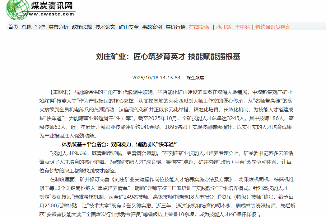 当能源保供的号角在时代浪潮中吹响,当智能化矿山建设的蓝图在煤海大地铺展,刘庄矿业始终将“技能人才”作为产业报国的核心支撑。从实操基地的火花四溅到大师工作室的匠心传承,从“名师带高徒”的薪火接续到全员机电练兵的热潮涌动,这座现代化矿井正以多元化举措、精准化培育、长效化机制,为技能人才搭建成长“快车道”,为能源事业锻造骨干“生力军”。截至2025年10月,全矿技能人才总量达3245人,其中技师186人、高级技师63人,近3年累计开展职业技能评价约140场,1895名职工实现技能等级提升,以实打实的人才培育成果,为产业报国注入强劲动能。