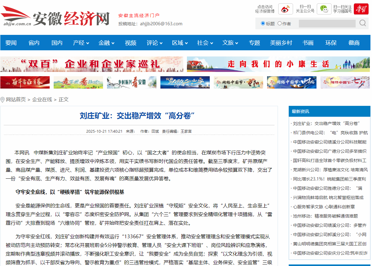刘庄矿业始终牢记“国之大者”,强化“产业报国”的使命担当,在煤炭市场下行压力中逆势突围,在保障安全生产、先进产能释放、促进提质增效中淬炼本领,用实干实绩书写新时代国企的责任答卷。截至三季度末,矿井原煤产量、商品煤产量、煤质、进尺、利润、基建投资六项核心指标超预算完成,单位成本和维简费用结余较预算双下降,交出了一份“安全有底、生产有力、效益有质、发展有魂”的高质量发展优异答卷。