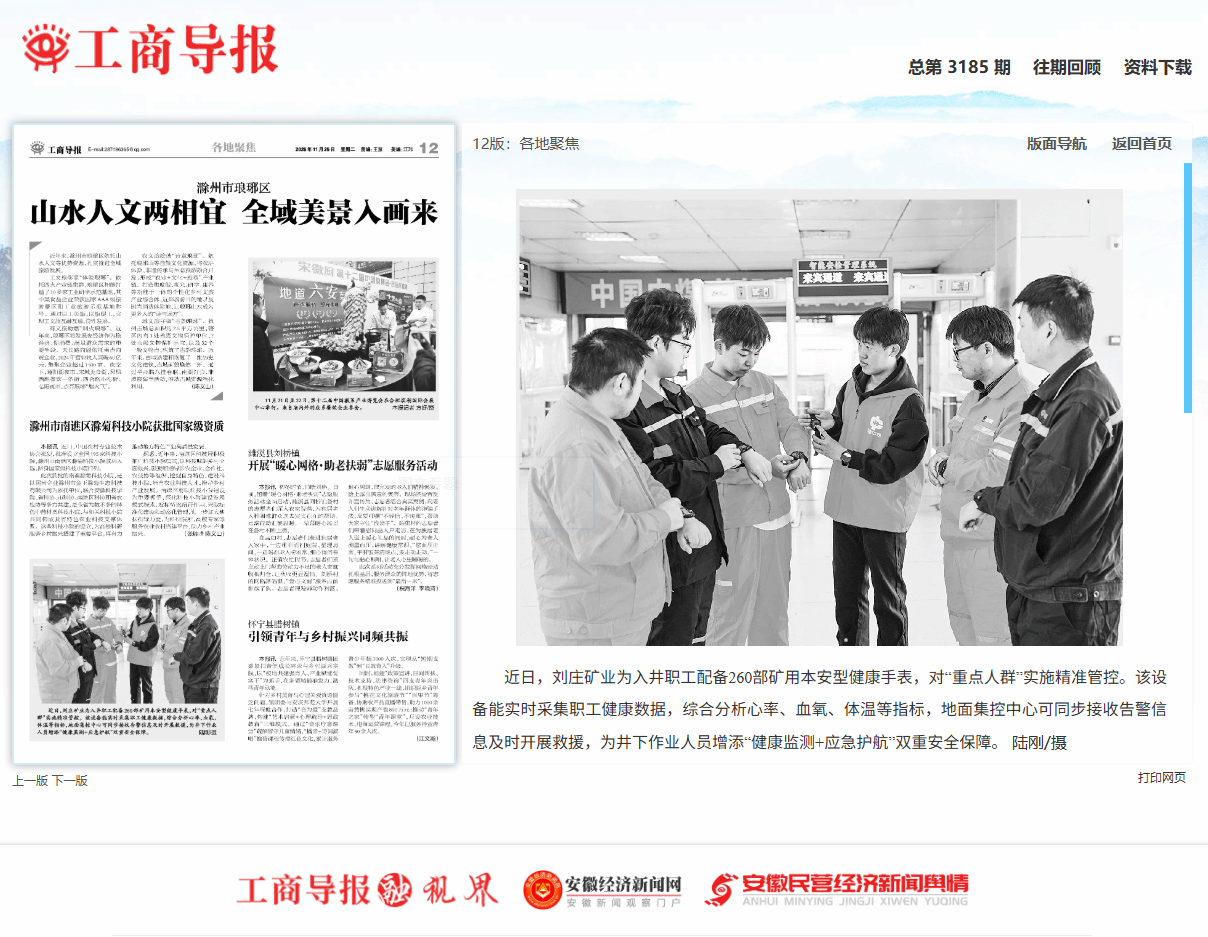 近日,刘庄矿业为入井职工配备260部矿用本安型健康手表,对“重点人群”实施精准管控。该设备能实时采集职工健康数据,综合分析心率、血氧、体温等指标,地面集控中心可同步接收告警信息及时开展救援,为井下作业人员增添“健康监测+应急护航”双重安全保障。