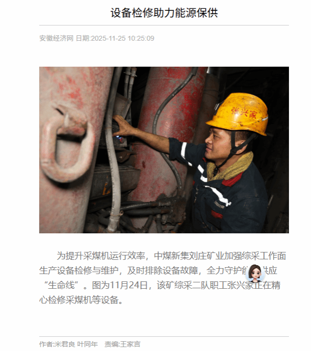 为提升采煤机运行效率,中煤新集刘庄矿业加强综采工作面生产设备检修与维护,及时排除设备故障,全力守护能源供应“生命线”。图为11月24日,该矿综采二队职工张兴家正在精心检修采煤机等设备。