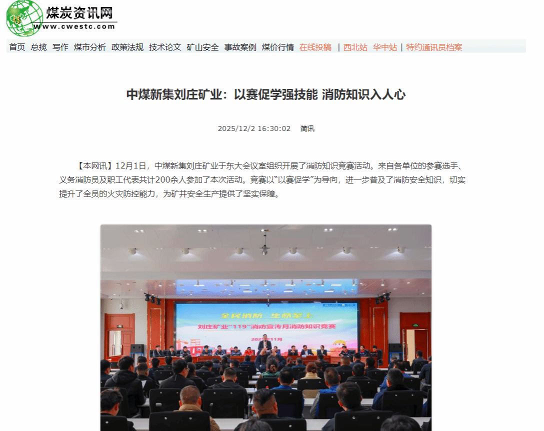 12月1日,中煤新集刘庄矿业于东大会议室组织开展了消防知识竞赛活动。来自各单位的参赛选手、义务消防员及职工代表共计200余人参加了本次活动。竞赛以“以赛促学”为导向,进一步普及了消防安全知识,切实提升了全员的火灾防控能力,为矿井安全生产提供了坚实保障。