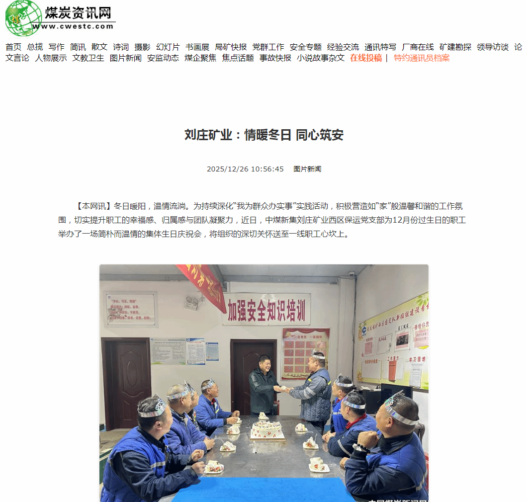 【本网讯】冬日暖阳,温情流淌。为持续深化“我为群众办实事”实践活动,积极营造如“家”般温馨和谐的工作氛围,切实提升职工的幸福感、归属感与团队凝聚力,近日,中煤新集刘庄矿业西区保运党支部为12月份过生日的职工举办了一场简朴而温情的集体生日庆祝会,将组织的深切关怀送至一线职工心坎上。