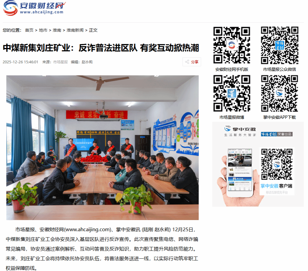 12月25日,中煤新集刘庄矿业工会协安员深入基层区队进行反诈宣传。此次宣传聚焦电信、网络诈骗常见骗局,协安员通过案例解析、互动问答普及反诈知识,助力职工提升风险防范能力。未来,刘庄矿业工会将持续依托协安员队伍,将普法服务送进一线,以实际行动筑牢职工权益保障防线。