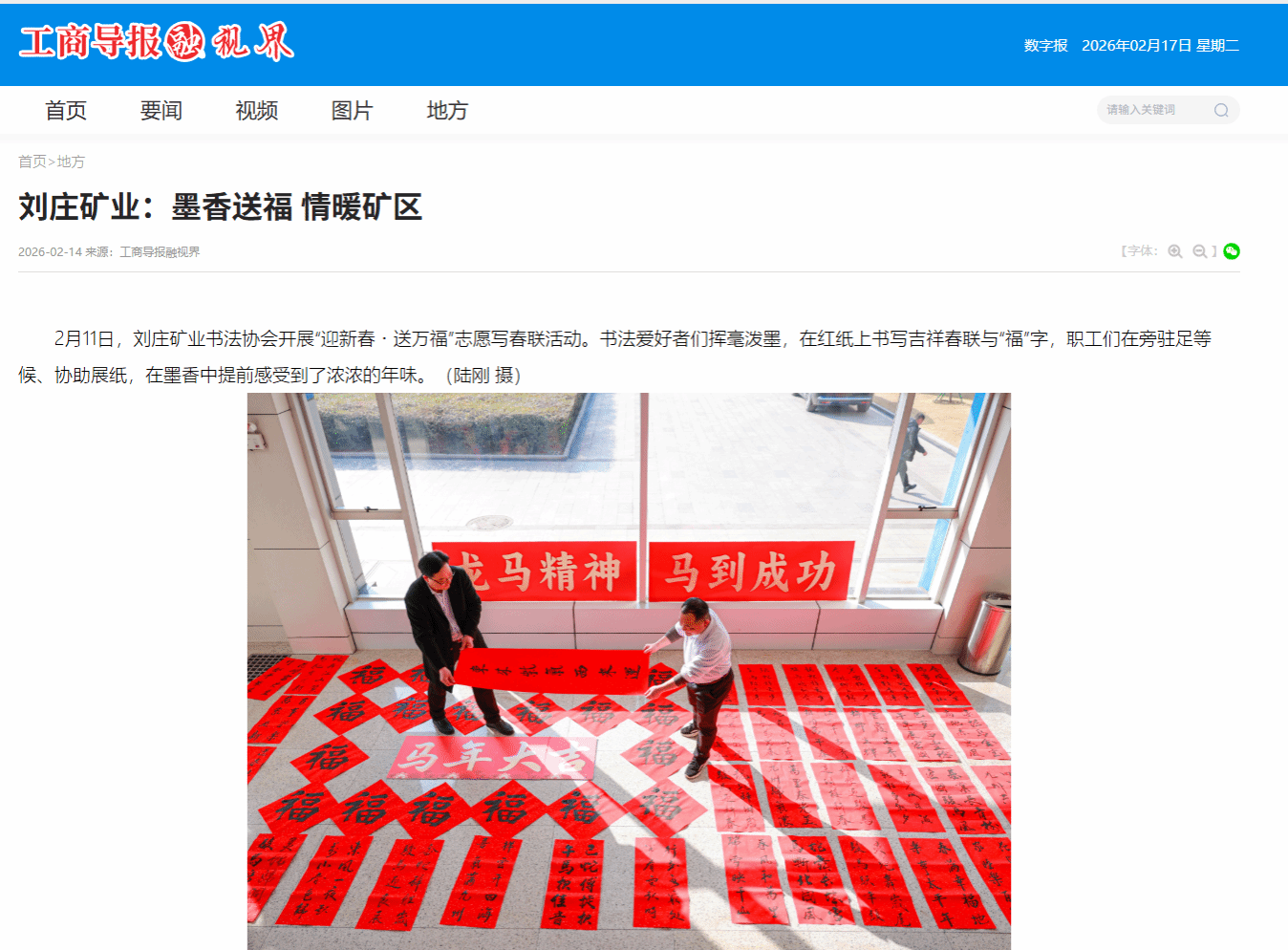 2月11日,刘庄矿业书法协会开展“迎新春・送万福”志愿写春联活动。书法爱好者们挥毫泼墨,在红纸上书写吉祥春联与“福”字,职工们在旁驻足等候、协助展纸,在墨香中提前感受到了浓浓的年味。