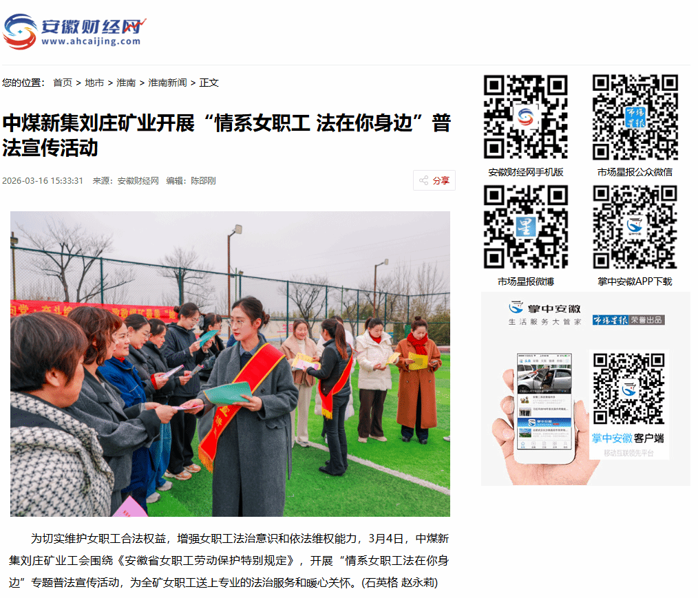 为切实维护女职工合法权益,增强女职工法治意识和依法维权能力,3月4日,中煤新集刘庄矿业工会围绕《安徽省女职工劳动保护特别规定》,开展“情系女职工法在你身边”专题普法宣传活动,为全矿女职工送上专业的法治服务和暖心关怀。