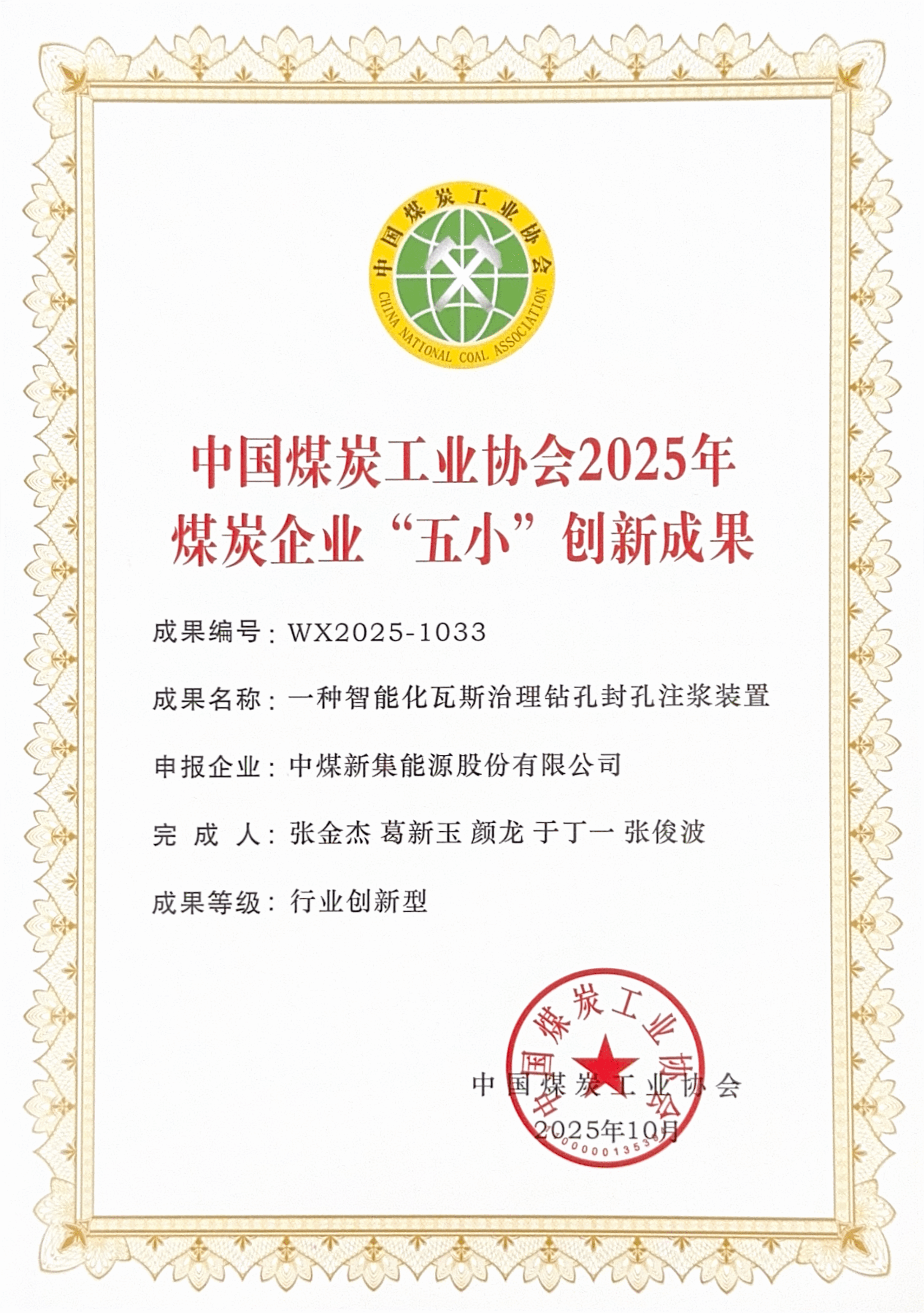 经中国煤炭工业协会组织评审,刘庄矿业申报的“一种智能化瓦斯治理钻孔封孔注浆装置”成功入选2025年煤炭企业“五小”创新成果,并获评“行业创新型”奖(为原一等奖档次成果)。