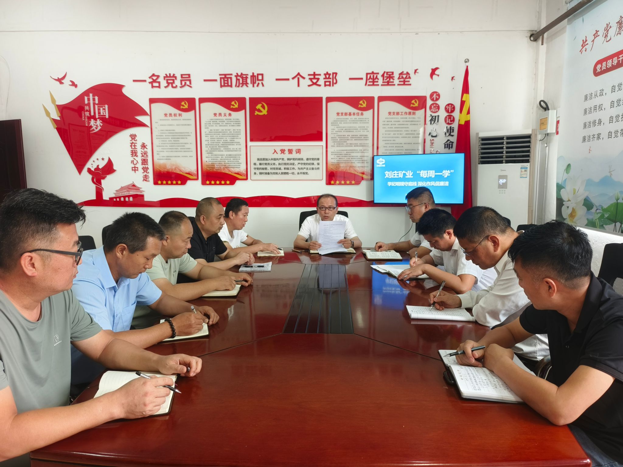 支部书记牵头在党员活动室召开廉政专题会,部署教育活动方案,并组织党员深入学习贯彻习近平新时代中国特色社会主义思想、党的二十大精神及党章党规党纪,围绕“政德建设”主题开展研讨,引导党员在思想碰撞中深化理解,将中央八项规定精神内化为行动自觉。同时,结合公司内部职工违纪违法案例讲授专题党课,用身边事教育身边人;同步开展红色教育,组织党员重温入党誓词,并参与矿纪委牵头的红色教育基地参观活动,让革命精神成为党性修养的“活教材”。