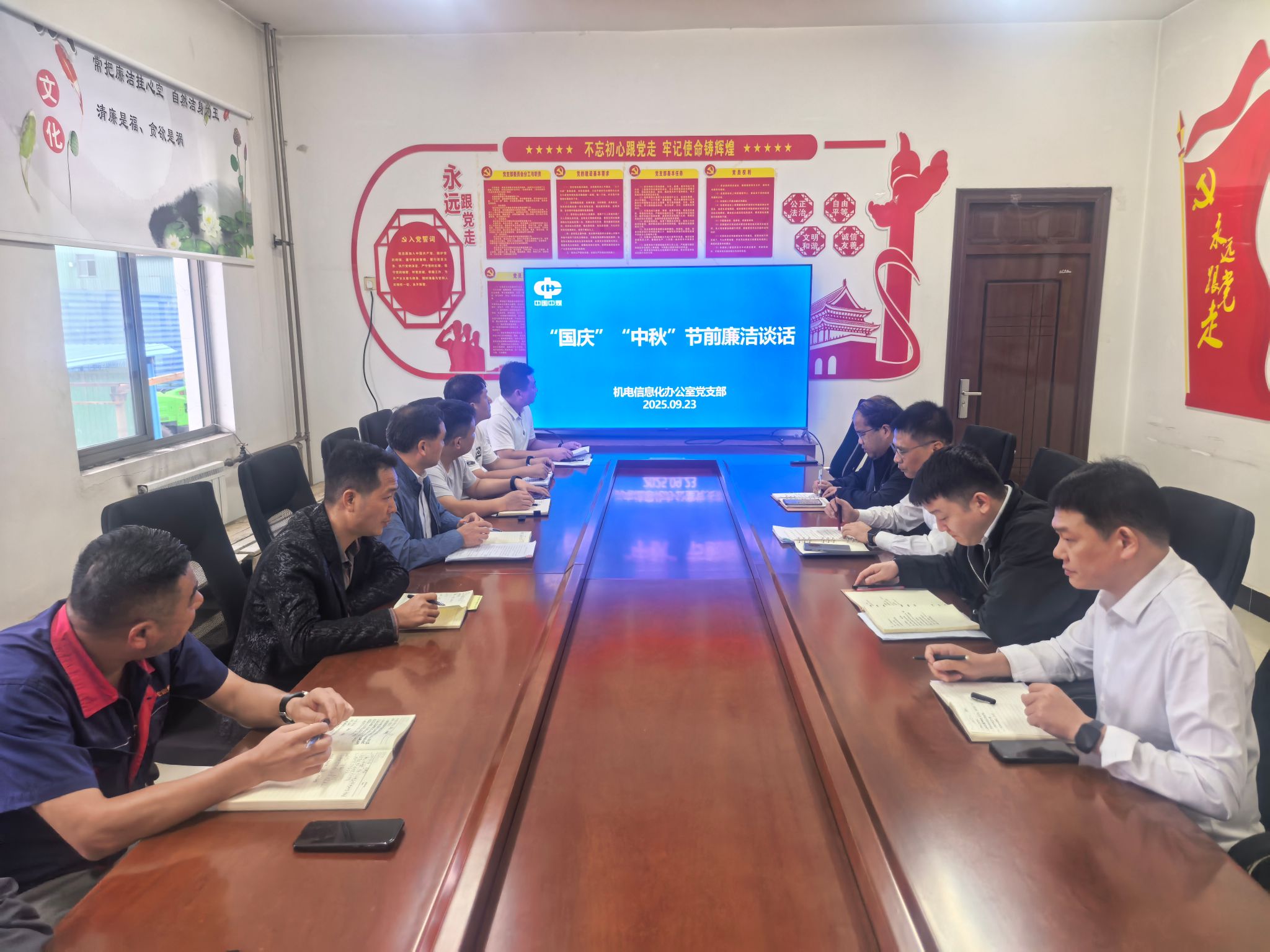 2025年中秋国庆“双节”将至,为锲而不舍落实中央八项规定精神,进一步严明纪律,驰而不息纠“四风”树新风。9月23日,刘庄矿业机电信息化办公室党支部在支部党员活动室开展节前廉洁提醒谈话,班组长以上管理人员、关键岗位人员参加。
