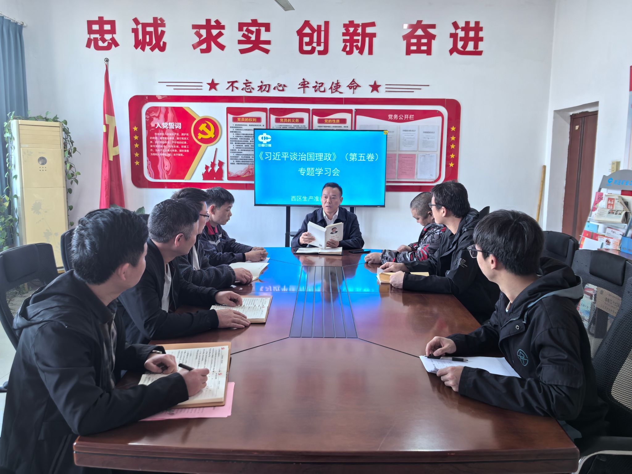 为深入学习贯彻习近平新时代中国特色社会主义思想,刘庄矿业西区生产准备党支部利用“每周一学”时间开展《习近平谈治国理政》第五卷学习活动,引导党员干部深刻领会书中精髓要义,以学促干,推动党支部建设和生产工作不断迈上新台阶。