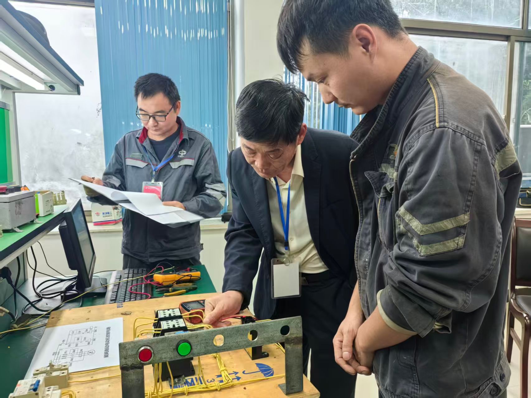 本次竞赛聚焦固定设备维修电工核心岗位需求,精准筛选参赛人员,最终确定来自机电党支部的 9 名骨干职工同台竞技。竞赛创新性采用 “理论 + 实操” 双模块考核模式,理论考试涵盖电气安全规范、固定设备电路原理、故障诊断基础等核心知识点,重点考察选手对专业理论的掌握深度;实操考核则围绕临时电路安装、复杂线路布设及控制电路调试三大核心任务展开,不仅要求选手在规定时间内完成操作,更对工艺规范性、安全防护措施、设备调试精度提出严格要求,全方位检验选手的综合技术能力。。比赛开始前,各位参赛选手摩拳擦掌,跃跃欲试。下午15:00随着裁判的一声令下,比赛正式开始。各位选手立即投入紧张的比赛中。面对复杂的电路图及各种电子元器件,参赛选手熟练并井然有序地操作,以严谨认真、临危不惧的态度面对这次竞赛,充分展现了自身的技术才能。