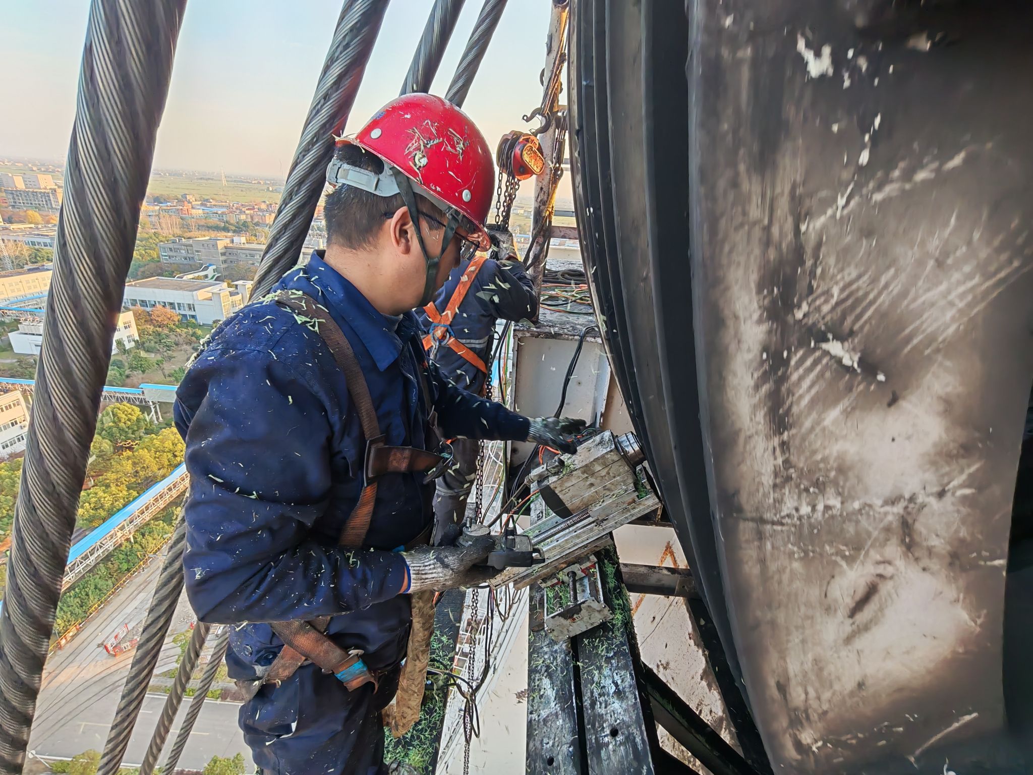施工过程中,团队采用先进的数控绳槽车削装置,通过全数字参数设定实现自动定位、精准切削,全程规避人工操作误差。施工人员分工明确、协作默契。施工过程中操作人员精准操控设备运行,保证切削精度达到要求。针对高空作业风力影响、绳槽磨损不均等难点,操作人员凭借丰富经验动态调整施工参数,在确保安全与质量的前提下,高效推进施工进度。