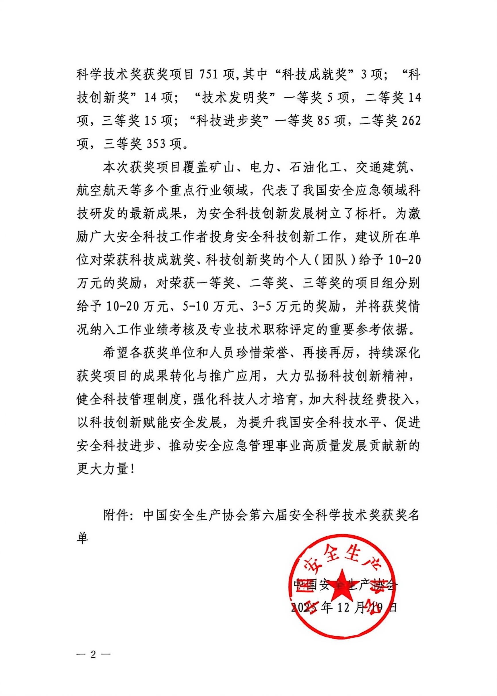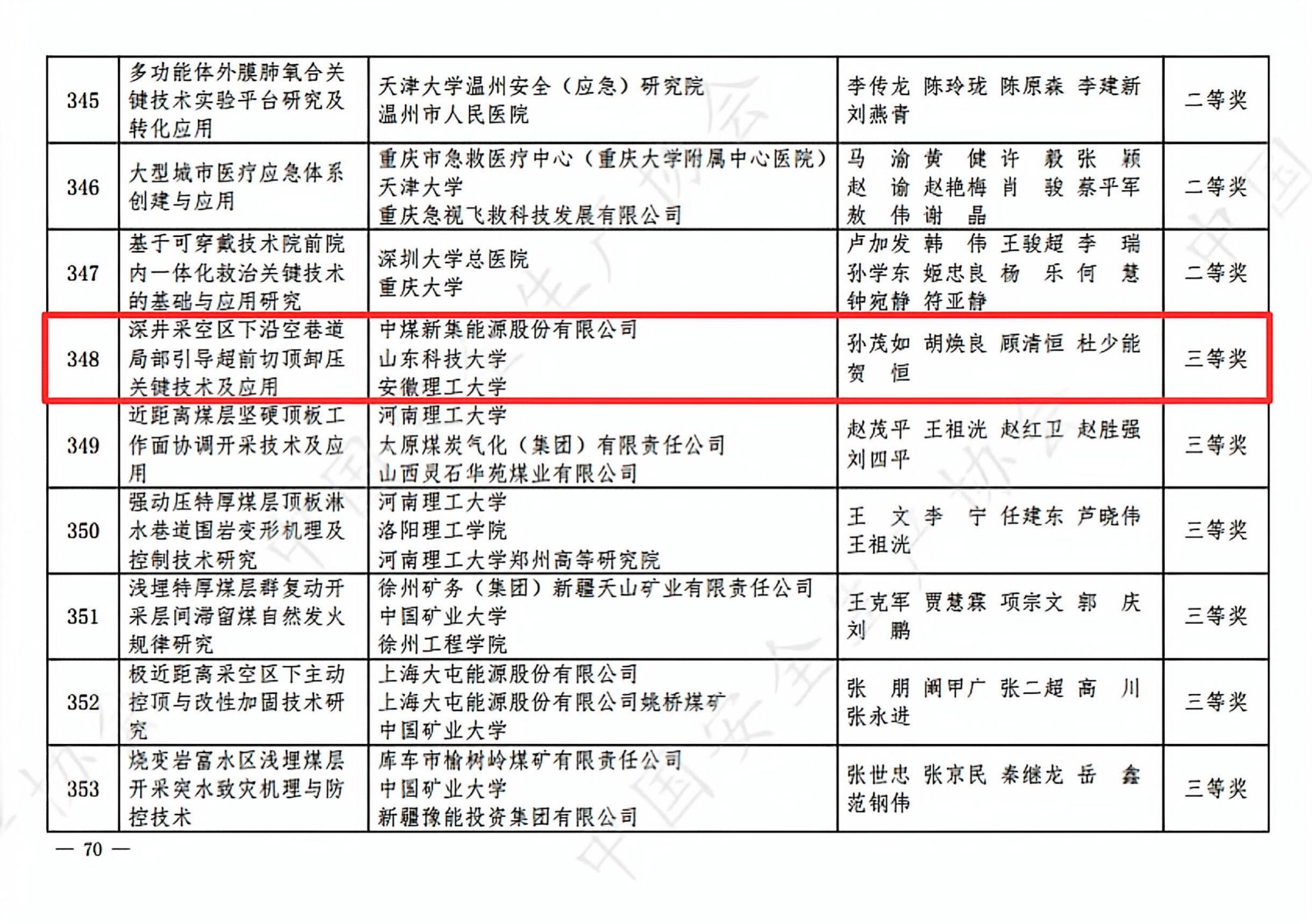 近日,中国安全生产协会发布《关于公布第六届安全科学技术奖获奖名单的通知》(中安协科技〔2025〕51号)。经过严格的形式审查、初评网评、会议评审、项目公示、现场答辩及评审委员会终评等多轮程序,中煤新集利辛矿业有限公司申报的《深井采空区下沿空巷道局部引导超前切顶卸压关键技术及应用》与《板集煤矿开采扰动下多含水层响应及水源识别技术研究》两项科技创新成果,均荣获第六届安全科学技术奖三等奖。