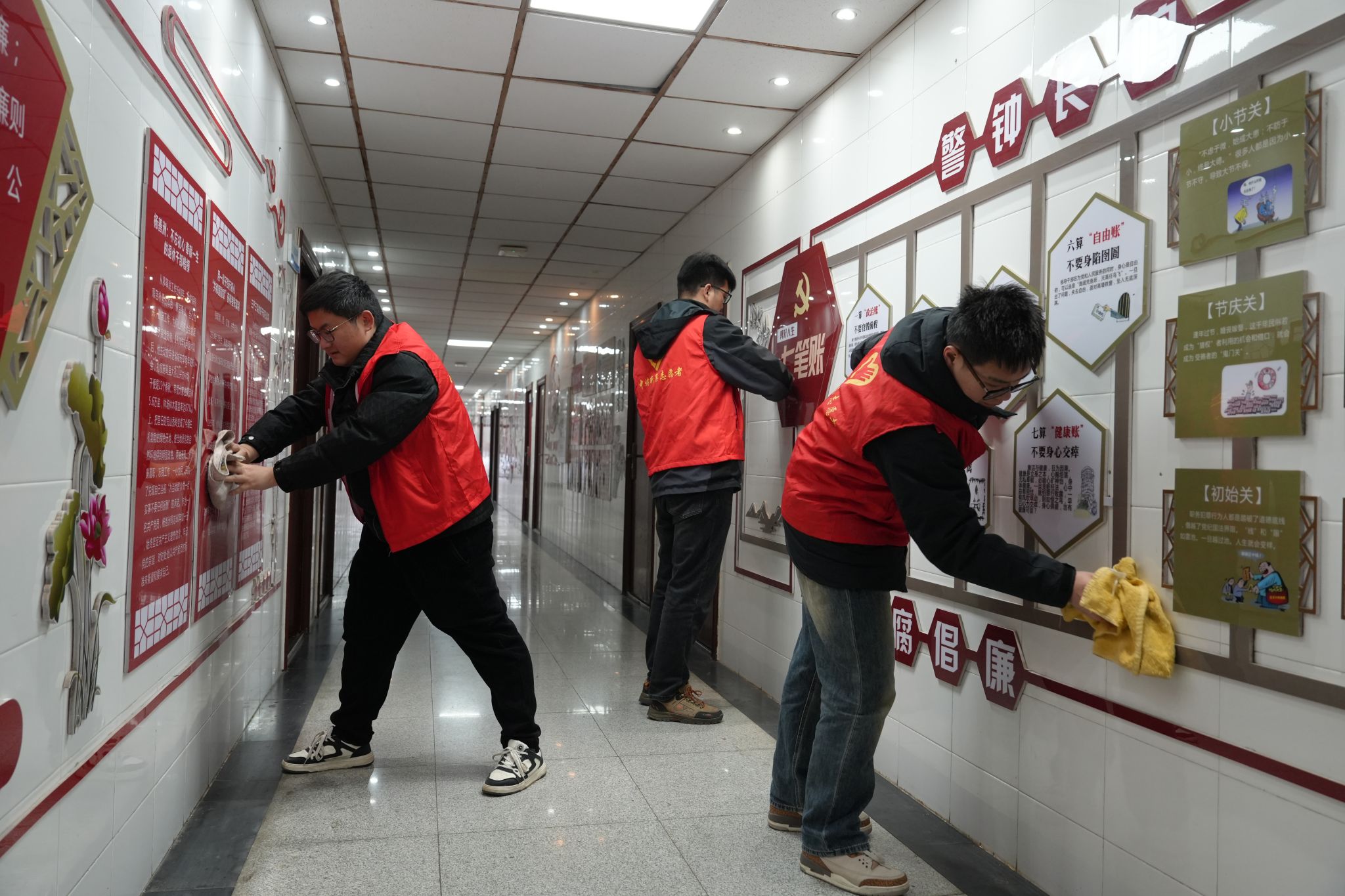 活动现场,身着红马甲的青年志愿者们分工明确、干劲十足,成为矿区春日里最耀眼的风景线。他们手持扫帚、抹布等工具,对职工之家的桌椅、门窗进行全面擦拭,清理角落杂物与卫生死角,规整图书报刊,让职工休憩、学习的环境焕然一新;在矿区文化长廊,志愿者们细致清理墙面污渍、擦拭宣传展板,认真检查维护宣传设施,重新梳理雷锋精神宣传内容,让文化阵地成为传递正能量的重要窗口。同时,志愿者们走进车间班组,分享雷锋故事、宣讲雷锋精神,引导广大职工将“螺丝钉”精神融入岗位实践,立足本职、爱岗敬业,形成“人人学雷锋、事事见精神”的浓厚氛围。
