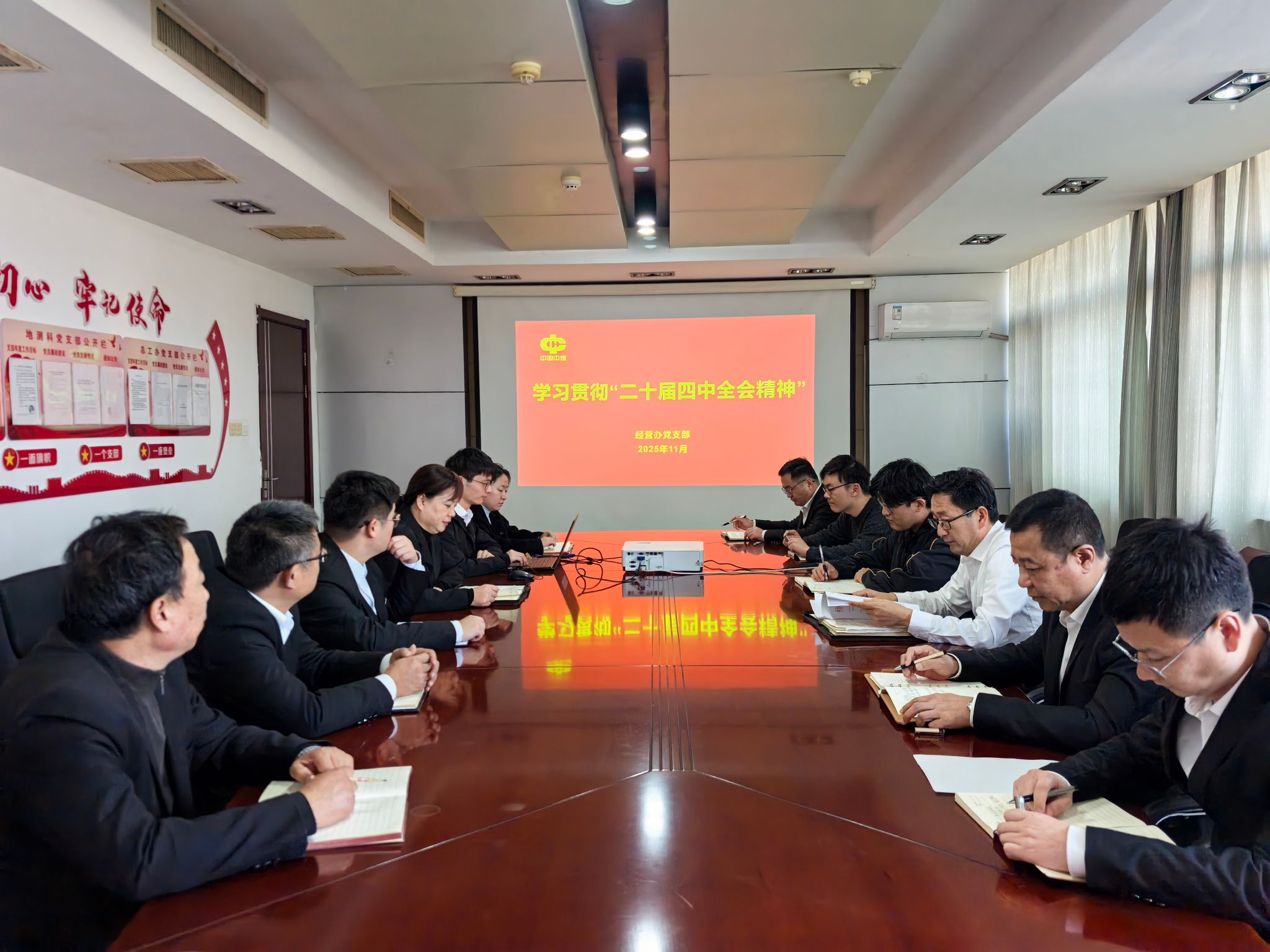 11月6日,经营办党支部以集中学习的形式深入学习贯彻党的二十届四中全会精神,党支部书记主持会议并领学,全体党员干部参加学习。