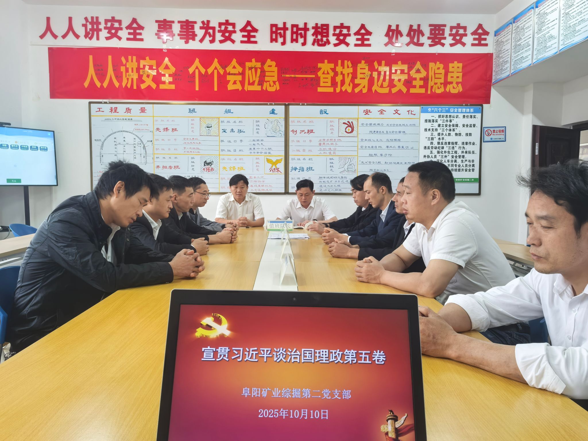 10月10日中班,阜阳矿业综掘第二党支部组织委员吴元动利用班前会时间,向党员群众宣讲“《习近平谈治国理政》”第五卷“继承和发扬党的优良革命传统和作风,弘扬延安精神”讲话内容:“习近平总书记要求全党同志要站稳人民立场,践行党的宗旨,贯彻党的群众路线,保持党同人民群众的血肉联系,自觉把以人民为中心的发展思想贯穿到各项工作之中。扎实推进共同富裕,让现代化建设成果更多更公平惠及全体人民。”