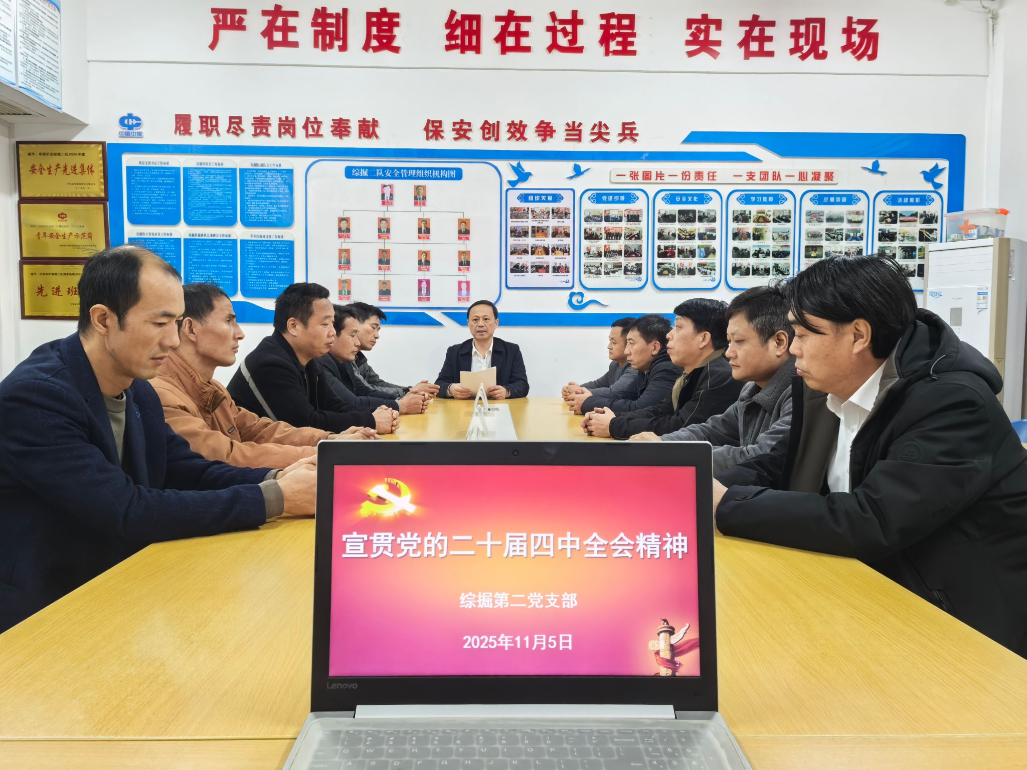 “10月20日至23日,党的二十届四中全会在北京举行,为未来5年我国发展擘画了蓝图。并在社会发展第十五个五年规划的建议中有15次提到安全,其中包括坚持统筹发展和安全、提高安全治理水平等内容”。该支部负责人简单介绍了会议召开的时间以及十五五等主要内容。要求党员及全体员工要利用学习强国、央视新闻以及党支部工作群转发的《中国共产党第二十届中央委员会第四次全体会议公报》等形式,认真学习全会内容,在思想上与党和国家保持高度一致;鼓励大家要增理想信念做到学以致用,并始终保持昂扬的精神状态,全身心投入到工作和学习中,爱岗敬业多做贡献;第十五个五年规划的建议中有15次提到安全,可见从国家层面上对安全的重视和严抓安全的必要性,我们要结合工作实际严格做到严管理、严问责,坚决做到不安全不生产,确保年底这50多天的安全生产。