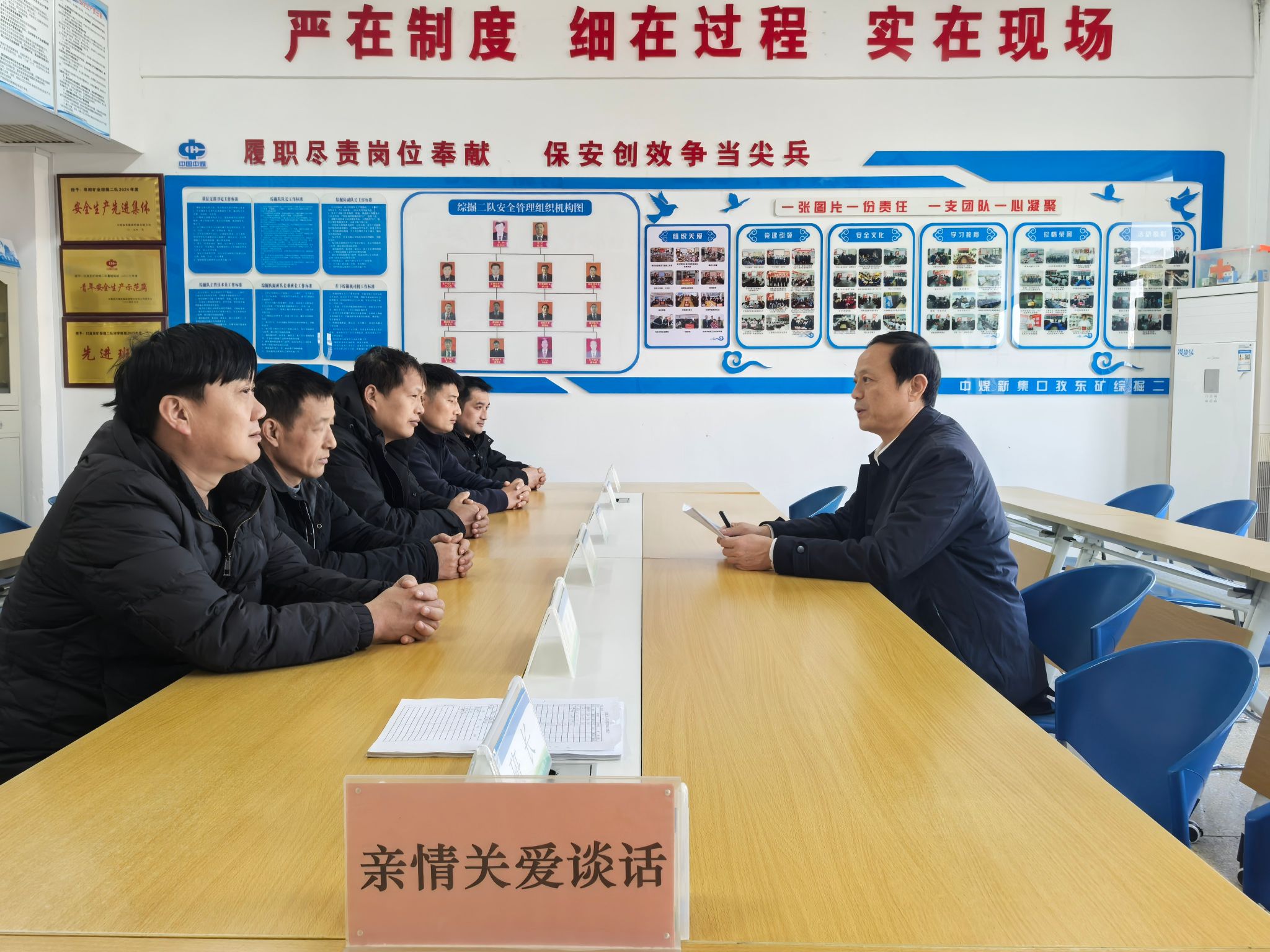 12月16日,阜阳矿业综掘第二党支部在综掘二队会议室与几名准备上中班的职工面对面促膝而谈,真诚、融洽的场景尽显出温馨和谐的区队人文环境。