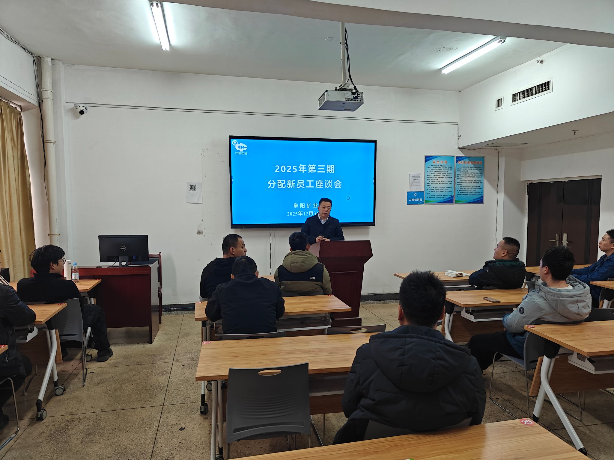 2025年12月31日下午,阜阳矿业在培训教室召开第三期分配新员工座谈会,人力资源科等职能科室负责同志、基层党支部书记、职工代表与新员工齐聚一堂,就新员工工作生活、休息休假、关心关爱等进行了交流座谈。
