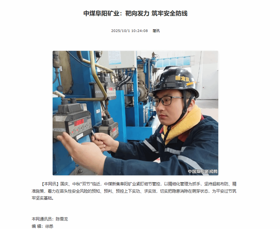 日期:2025-10-09 文章来源:阜阳矿业 作者:陈雪龙 点击数:
