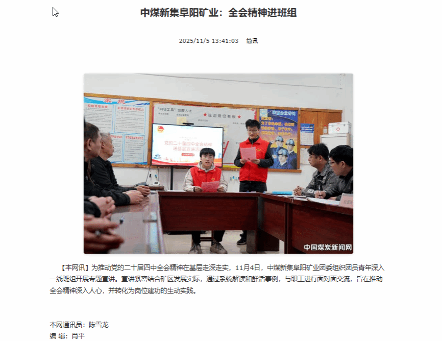 为推动党的二十届四中全会精神在基层走深走实,11月4日,阜阳矿业团委组织团员青年深入一线班组开展专题宣讲。宣讲紧密结合矿区发展实际,通过系统解读和鲜活事例,与职工进行面对面交流,旨在推动全会精神深入人心,并转化为岗位建功的生动实践。