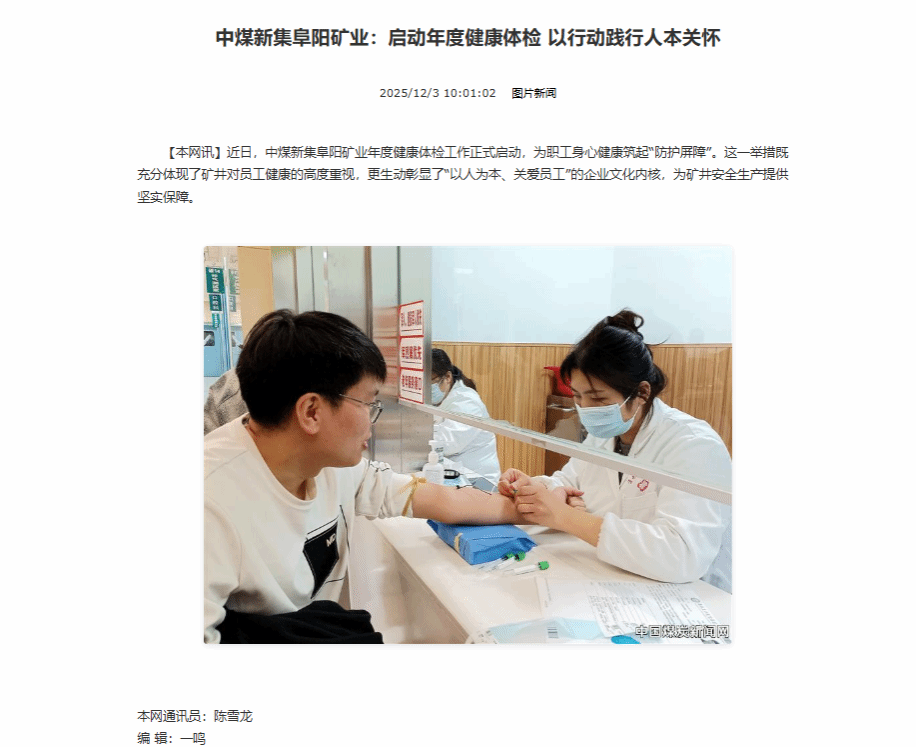 近日,中煤新集阜阳矿业年度健康体检工作正式启动,为职工身心健康筑起 “防护屏障”。这一举措既充分体现了矿井对员工健康的高度重视,更生动彰显了 “以人为本、关爱员工” 的企业文化内核,为矿井安全生产提供坚实保障。