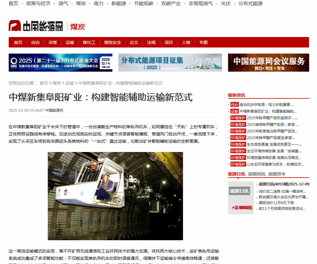 在中煤新集阜阳矿业千米井下的巷道中,一台台满载生产物料的单轨吊机车,如同悬挂在“天轨”上的专属列车,正依照预设路线有序穿梭。沿途动态视频实时监视、关键节点语音智能播报、巷道风门自动开闭,一套流程下来,实现了从采区车场到各采掘迎头各类物料的“一站式”直达运输,勾勒出矿井智能辅助运输的全新图景。