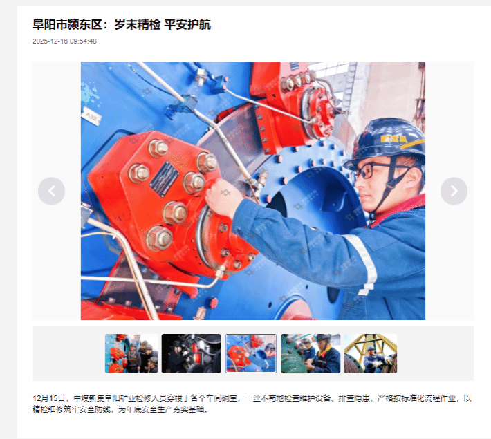 12月15日,中煤新集阜阳矿业检修人员穿梭于各个车间硐室,一丝不苟地检查维护设备、排查隐患,严格按标准化流程作业,以精检细修筑牢安全防线,为年底安全生产夯实基础。