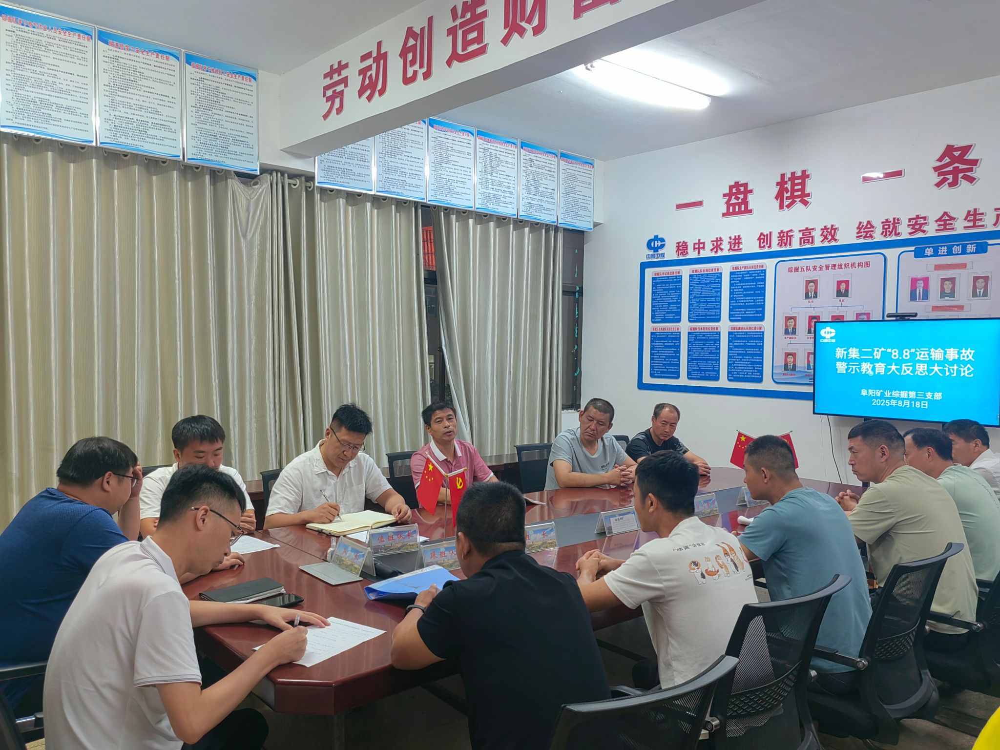 为深刻汲取新集二矿“8.8”运输事故教训,全面贯彻安全生产大反思、大整治活动相关要求,强化全员安全意识,压实安全生产责任。近日,阜阳矿业综掘第三支部以“以案为鉴、警钟长鸣”为主题,分管领导亲自参加,在支部范围内开展安全生产“大反思、大讨论”专项活动。通过事故警示、全员反思、隐患查摆、措施优化,进一步筑牢安全生产防线,为矿井高质量发展保驾护航。