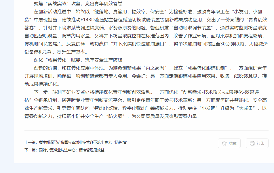 在创新活动推进中,始终以“能落地、真管用、提效率、保安全”为检验标准,鼓励青年职工“小发明、小创造”中展现担当,陆续推动E143D液压站主备恒减速切换试验装置等创新成果成功应用交出了一份亮眼的“青春创效答卷”针对井下喷淋系统调控精度低、水资源浪费的问题,督促研发“自动喷淋调节装置”,通过实时监测粉尘浓度自动匹配喷淋量,既节约用水量,又将井下粉尘浓度控制在标准范围内,改善了作业环境;面对采煤机加油流程繁琐、停机时间长的痛点,反复试验,成功改进“井下采煤机快速加油接口”,将单次加油时间缩短至30分钟以内,大幅减少设备停机损耗,提升生产效率