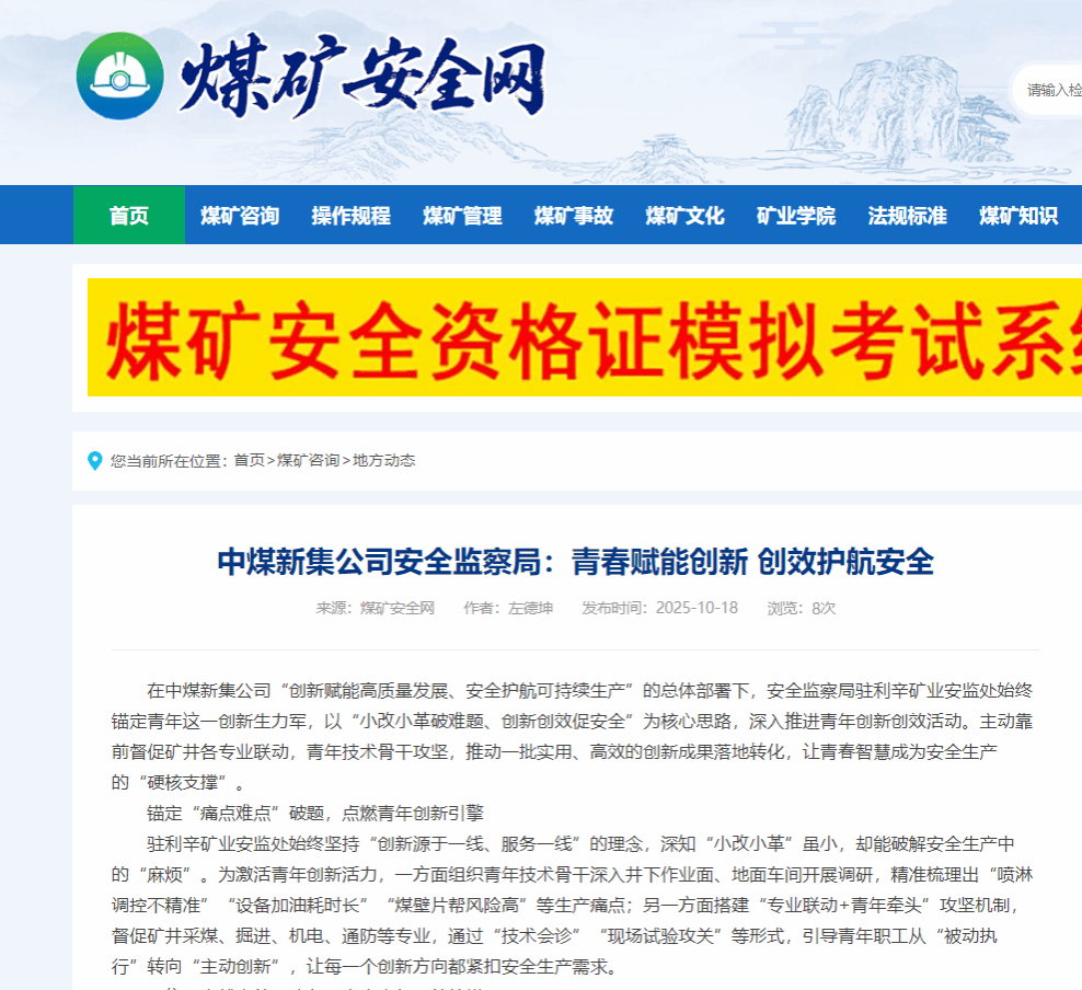 在中煤新集公司“创新赋能高质量发展、安全护航可持续生产”的总体部署下,安全监察局驻利辛矿业安监处始终锚定青年这一创新生力军,以“小改小革破难题、创新创效促安全”为核心思路,深入推进青年创新创效活动。主动靠前督促矿井各专业联动青年技术骨干攻坚,推动一批实用、高效的创新成果落地转化,让青春智慧成为安全生产的“硬核支撑”。
