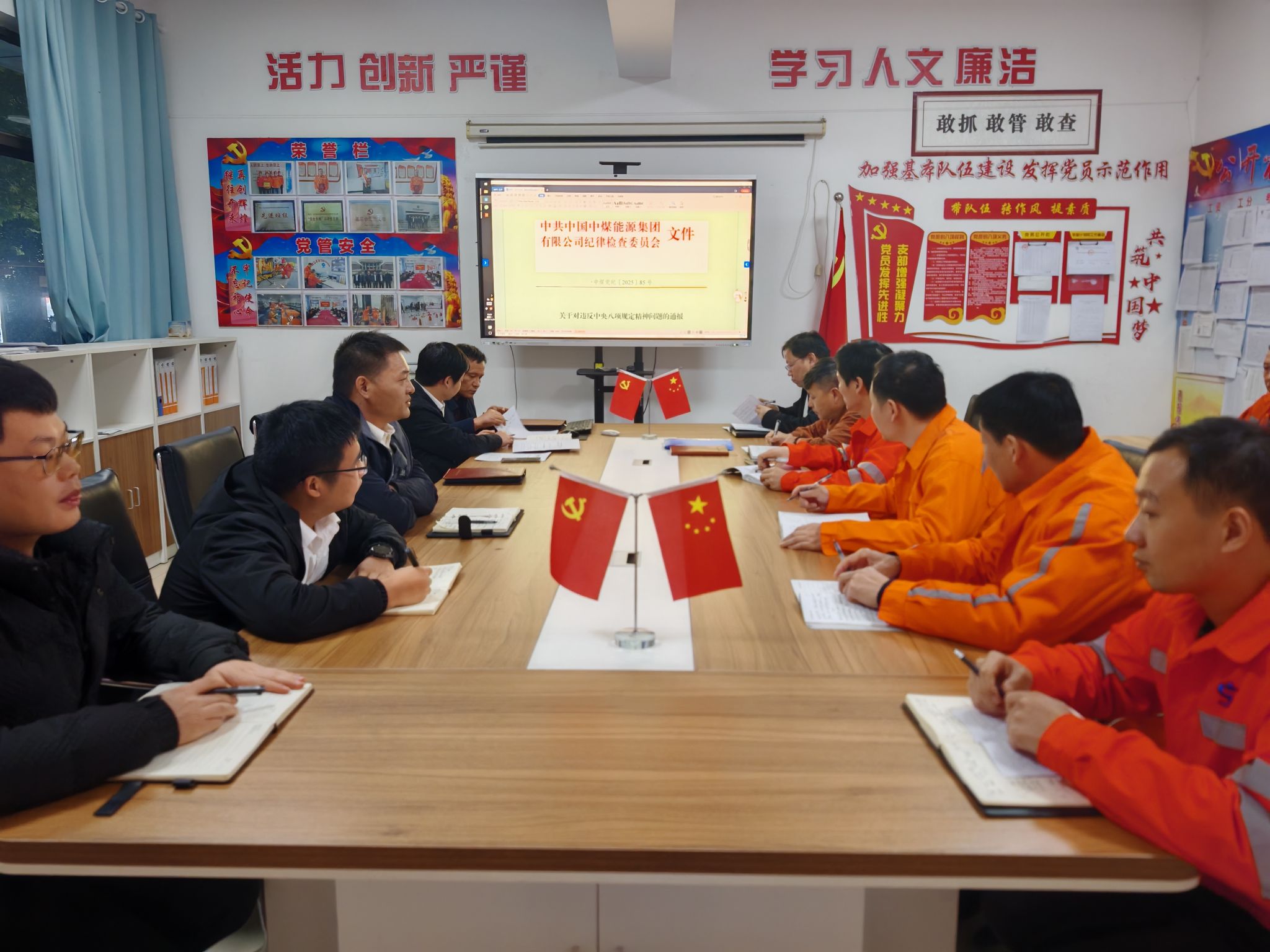 活动中,支部书记带领大家学习12起关于违反中央八项规定精神问题的通报,深入分析查找问题根源,并就进一步推进廉政建设和作风建设。对党员干部及全体安监人员提出要求,一是全体人员要坚持“严”字当头,严格自我约束,认真履行党风廉政建设职责,强化自身廉政建设,时刻保持清醒头脑,牢记廉洁承诺,杜绝“吃、拿、卡、要”行为,严防节日腐败。二是遵规守纪,严以律己。要始终把纪律和规矩挺在前面,严格要求自己,带头遵规守纪,严守红线底线,时刻绷紧纪律作风之弦,筑牢廉洁自律防线,让“净心守正明德”入脑入心,让“知纪明规懂法”走深走实。三是严格执行安监人员“十不准”“五严禁”等规定,做到讲规矩、守纪律、作风过硬,时刻保持警觉,坚守岗位、履行请销假制度、严禁酒后上岗。四是正确行使“微权力”,做到严格执法、公正执法、文明执法、廉洁执法,加强现场安全监督检查,为矿井安全生产持续稳定保驾护航。