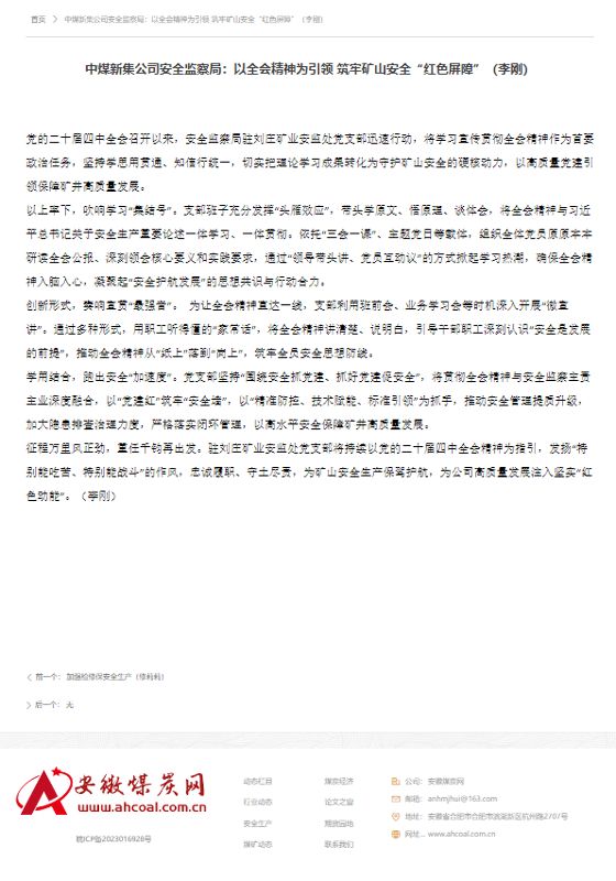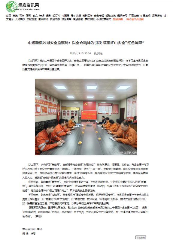 党的二十届四中全会召开以来,安全监察局驻刘庄矿业安监处党支部持续组织学习贯彻全会精神,切实把理论学习成果转化为守护矿山安全的硬核动力,保障矿井安全生产持续稳定。