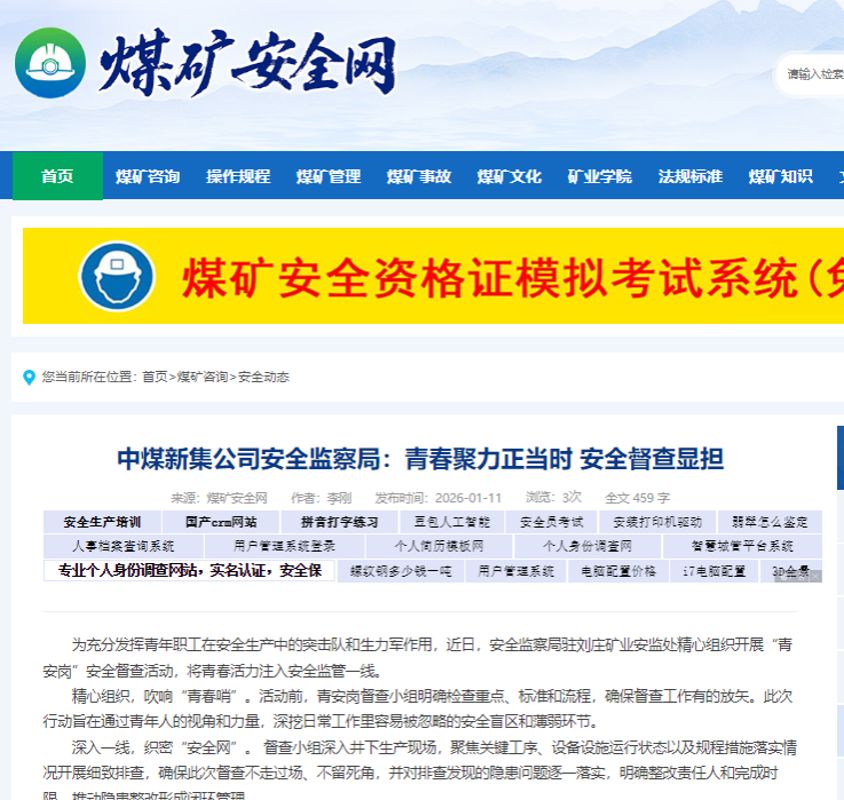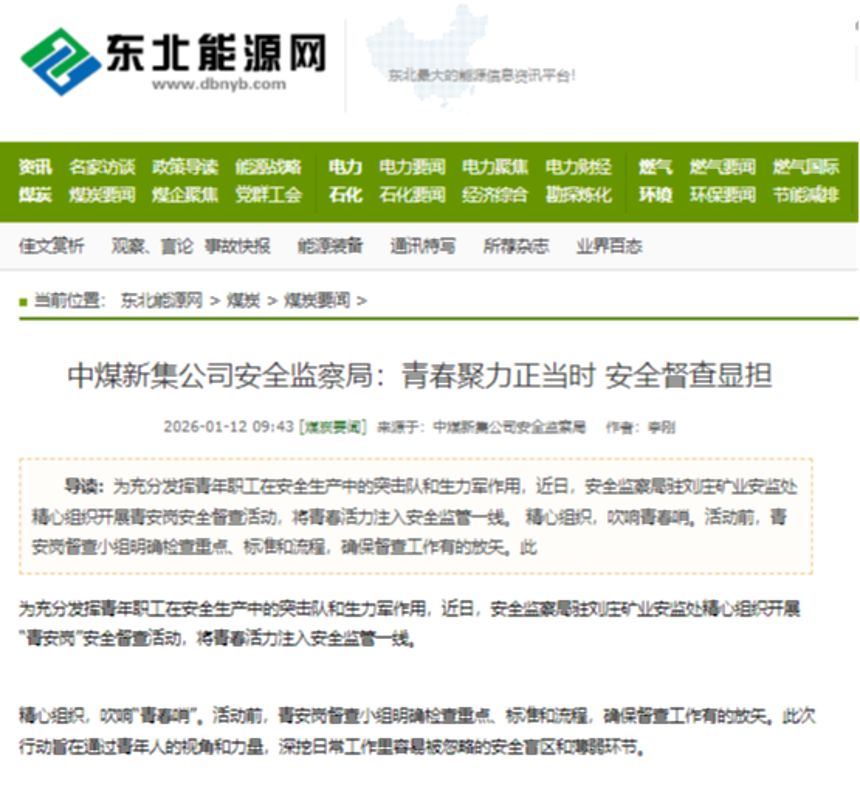《煤矿安全网》《煤炭资讯网》《东北能源网》中煤新集公司安全监察局:青春聚力正当时 安全督查显担当