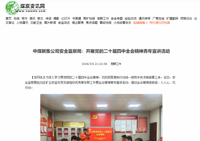 为深入学习贯彻党的二十届四中全会精神,切实把思想和行动统一到党中央决策部署上来,近日,安全监察局驻刘庄矿业安监处党支部组织优秀青年职工开展全会精神青年宣讲活动,推动全会精神进班组、入人心、见行动。