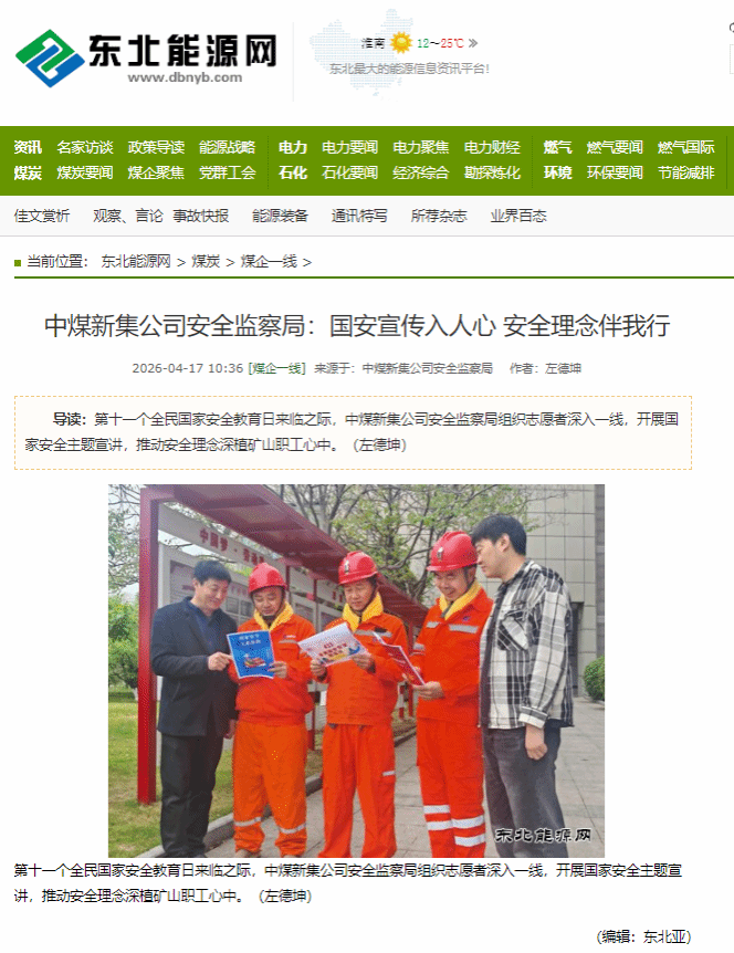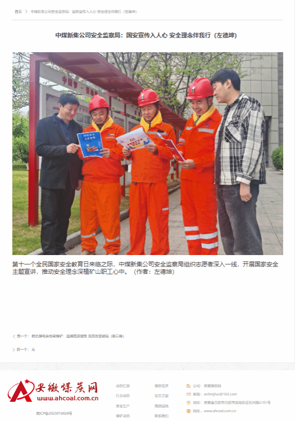 《东北能源网》《安徽煤炭网》中煤新集公司安全监察局:国家安全宣传入人心安全理念伴我行