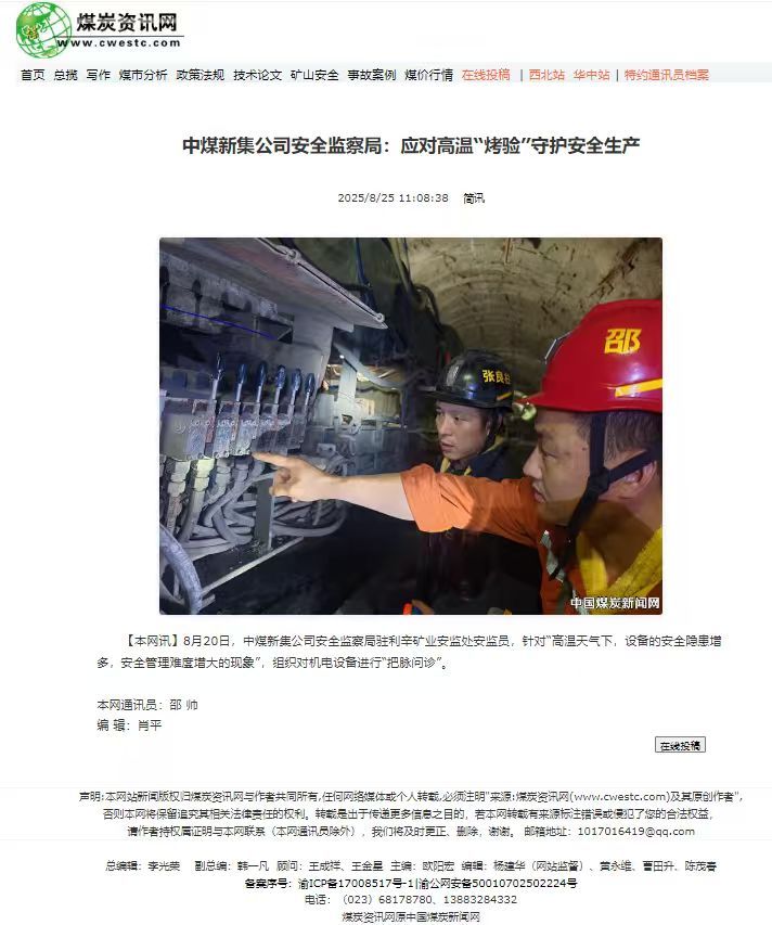 8月20日,中煤新集公司安全监察局驻利辛矿业安监处安监员,针对“高温天气下,设备的安全隐患增多,安全管理难度增大的现象”,主动迎接高温“烤验”,组织对机电设施进行“把脉问诊”。