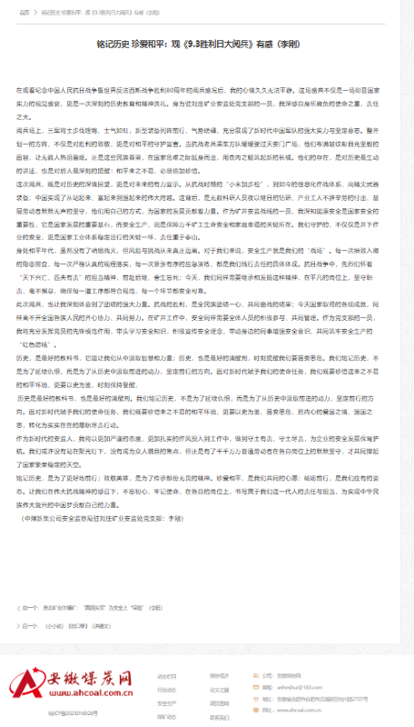 此次阅兵,也让我深刻体会到了团结的强大力量。抗战的胜利,是全民族团结一心、共同奋战的结果;今天国家取得的各项成就,同样离不开全国各族人民的齐心协力、共同努力。在矿井工作中,安全同样需要全体人员的积极参与、共同管理。作为党支部的一员,我将充分发挥党员的先锋模范作用,带头学习安全知识,积极宣传安全理念,带动身边的同事增强安全意识,共同筑牢安全生产的“红色防线”。