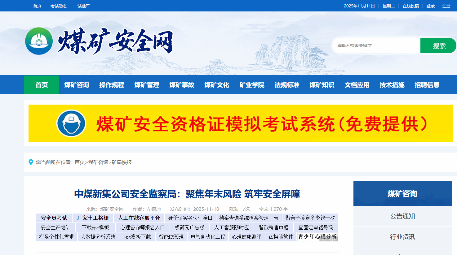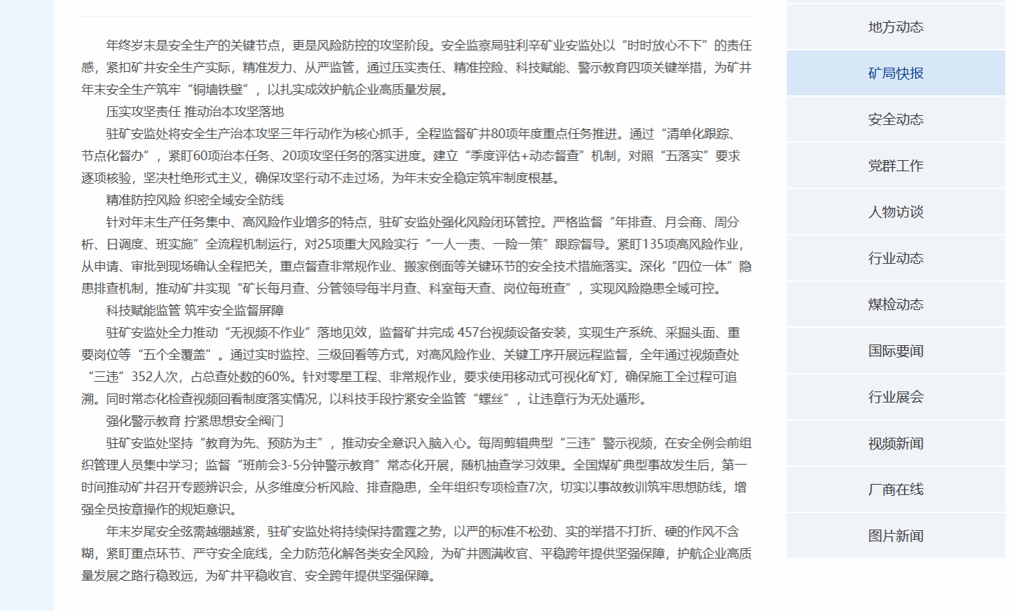 年终岁末是安全生产的关键节点,更是风险防控的攻坚阶段。安全监察局驻利辛矿业安监处以“时时放心不下”的责任感,紧扣矿井安全生产实际,精准发力、从严监管,通过压实责任、精准控险、科技赋能、警示教育四项关键举措,为矿井年末安全生产筑牢“铜墙铁壁”,以扎实成效护航企业高质量发展。