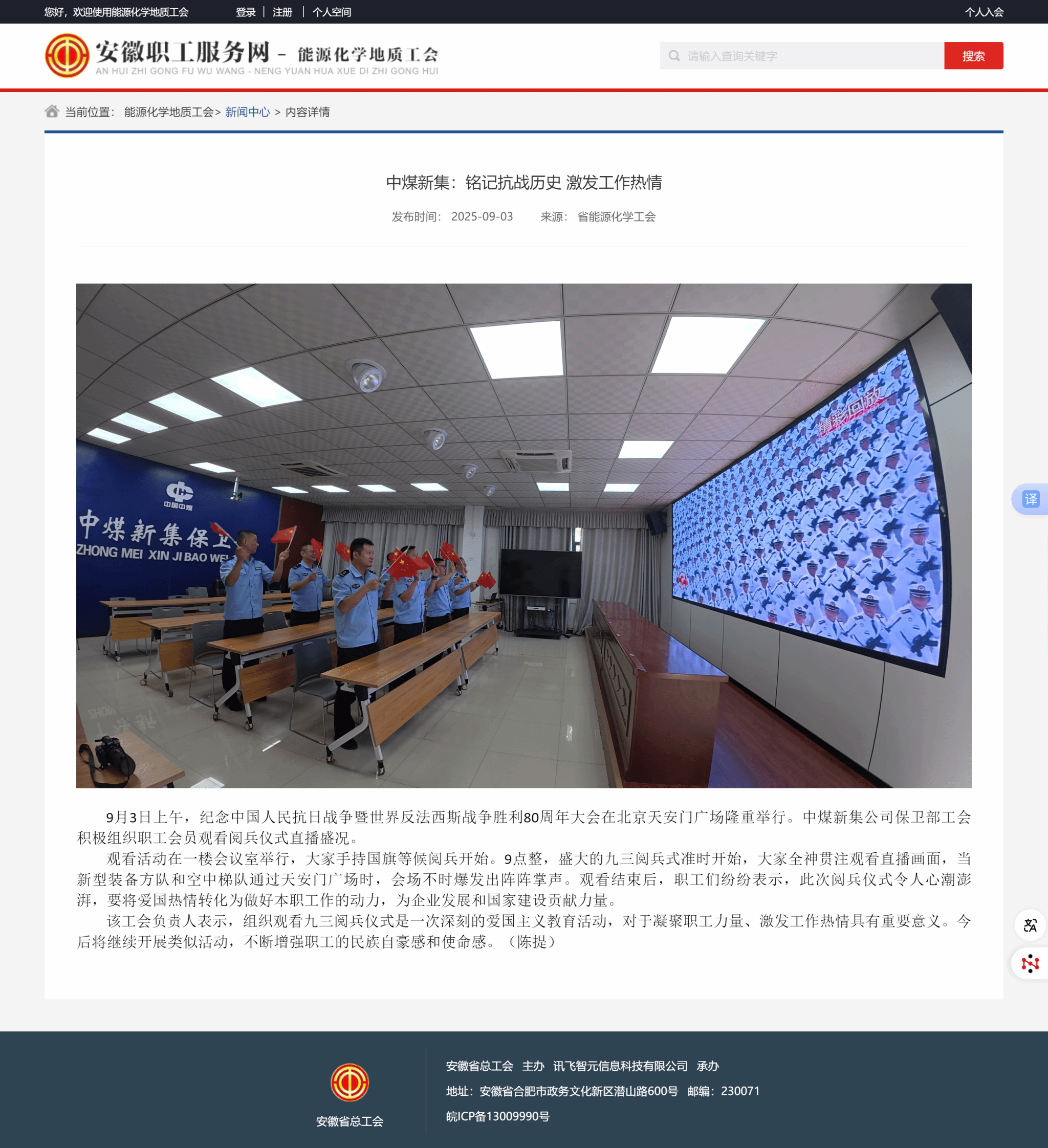 9月3日上午,纪念中国人民抗日战争暨世界反法西斯战争胜利80周年大会在北京天安门广场隆重举行。中煤新集公司保卫部工会积极组织职工会员观看阅兵仪式直播盛况。