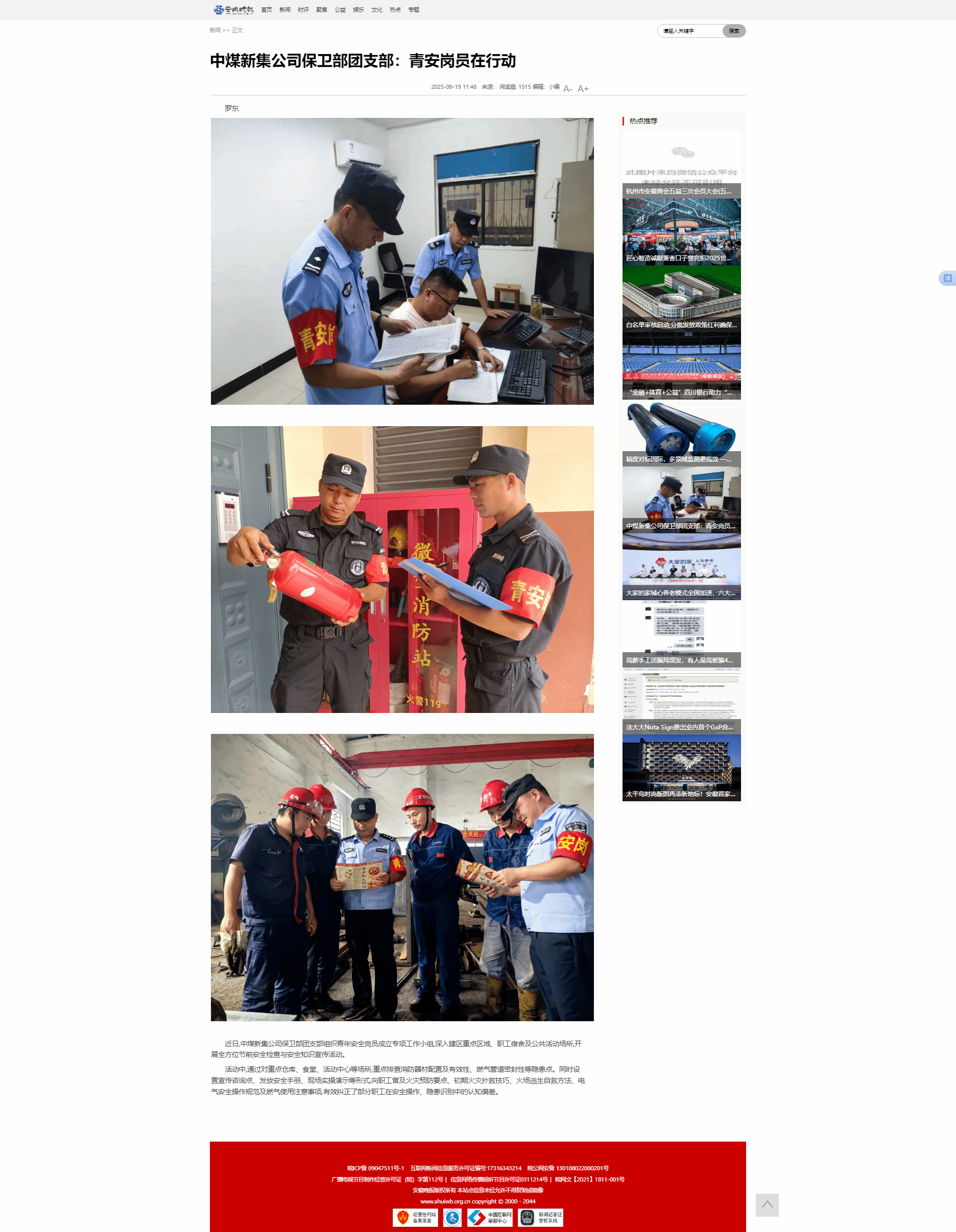 近日,中煤新集公司保卫部团支部组织青年安全岗员成立专项工作小组,深入辖区重点区域、职工宿舍及公共活动场所,开展全方位节前安全检查与安全知识宣传活动。