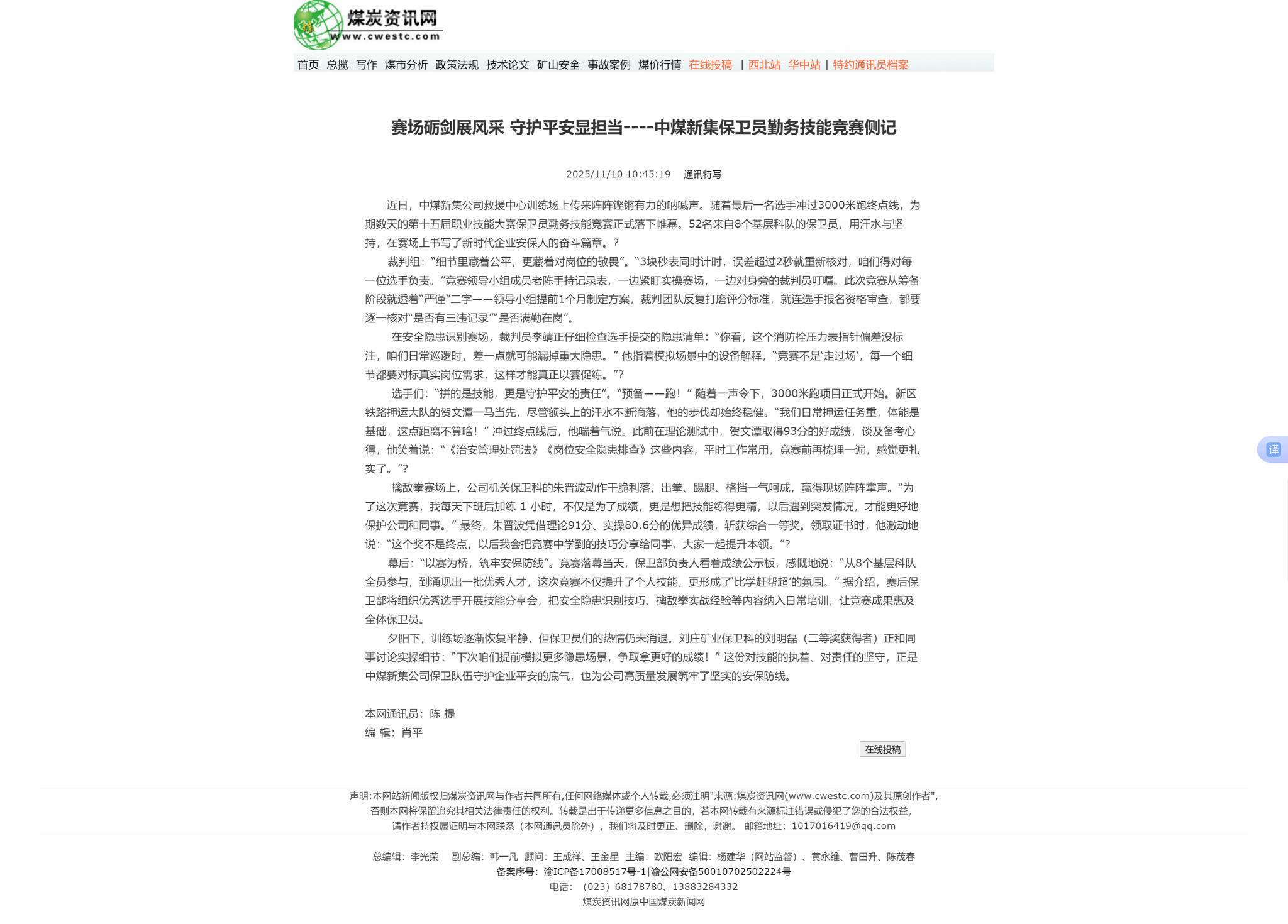 幕后:“以赛为桥,筑牢安保防线”。竞赛落幕当天,保卫部负责人看着成绩公示板,感慨地说:“从8个基层科队全员参与,到涌现出一批优秀人才,这次竞赛不仅提升了个人技能,更形成了‘比学赶帮超’的氛围。” 据介绍,赛后保卫部将组织优秀选手开展技能分享会,把安全隐患识别技巧、擒敌拳实战经验等内容纳入日常培训,让竞赛成果惠及全体保卫员。