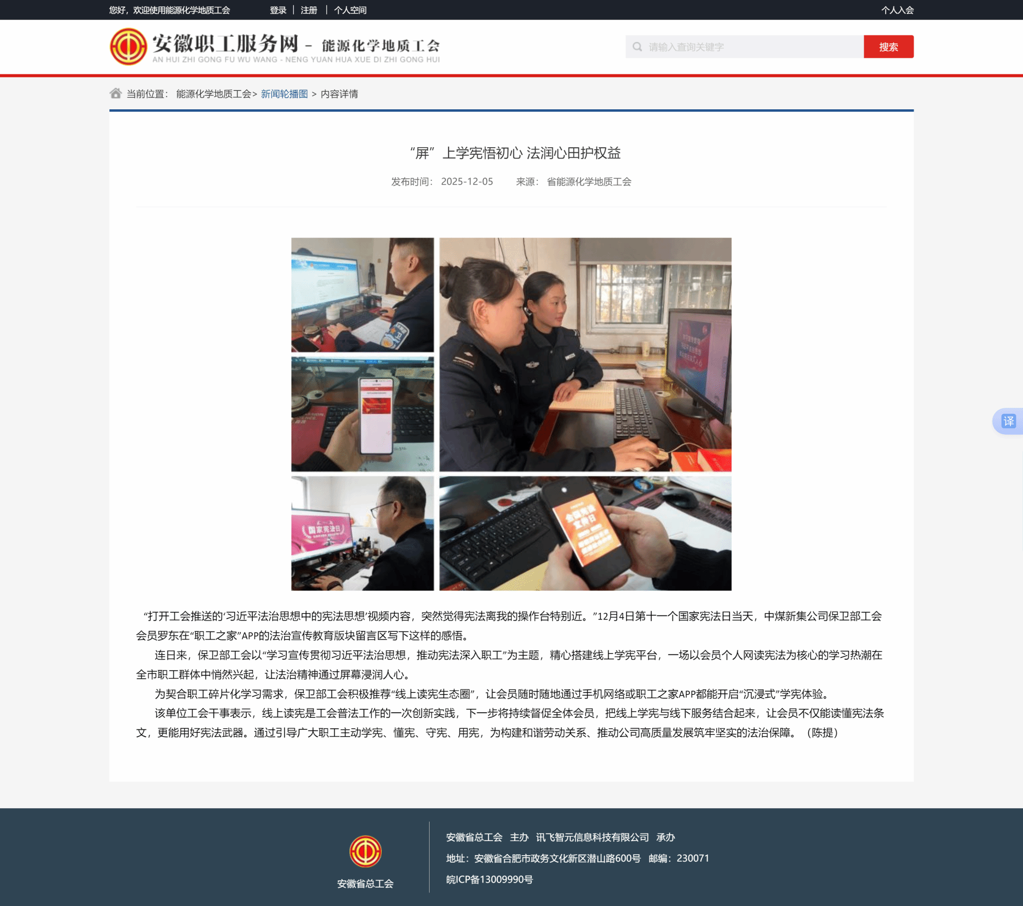 “打开工会推送的‘习近平法治思想中的宪法思想’视频内容,突然觉得宪法离我的操作台特别近。”12月4日第十一个国家宪法日当天,中煤新集公司保卫部工会会员罗东在“职工之家”APP的法治宣传教育版块留言区写下这样的感悟。