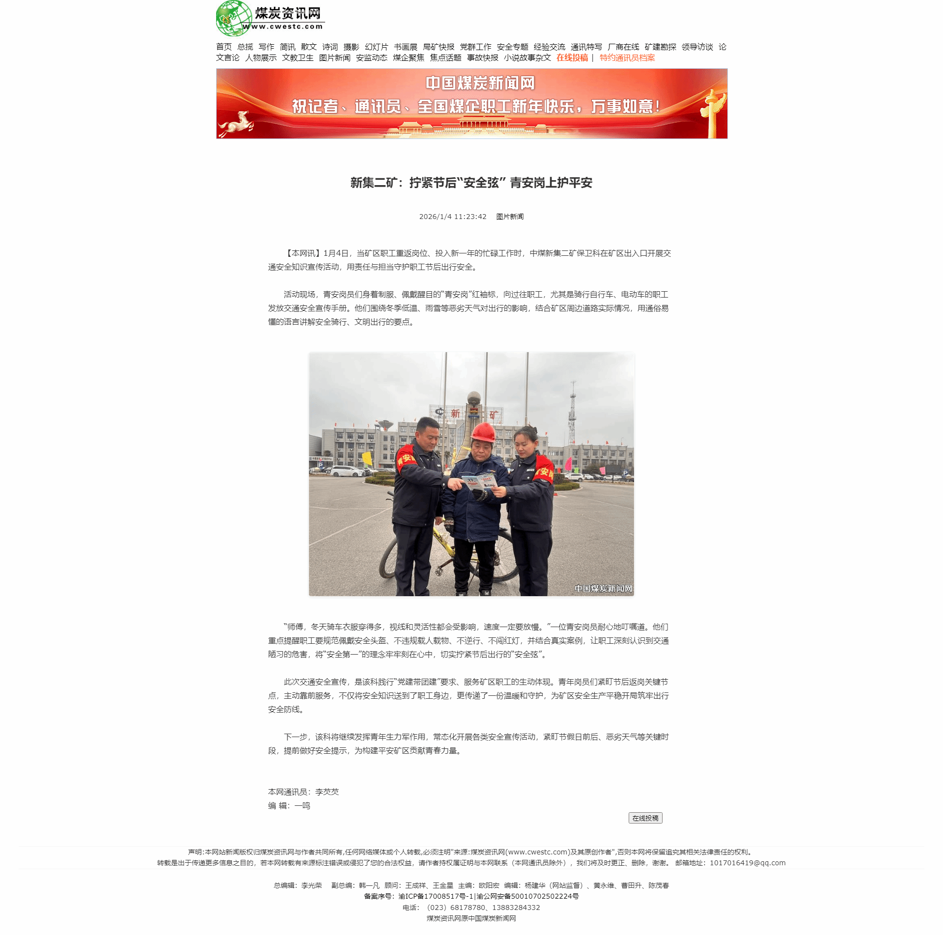 1月4日,当矿区职工重返岗位、投入新一年的忙碌工作时,中煤新集公司保卫部新集二矿保卫科在矿区出入口开展交通安全知识宣传活动,用责任与担当守护职工节后出行安全。