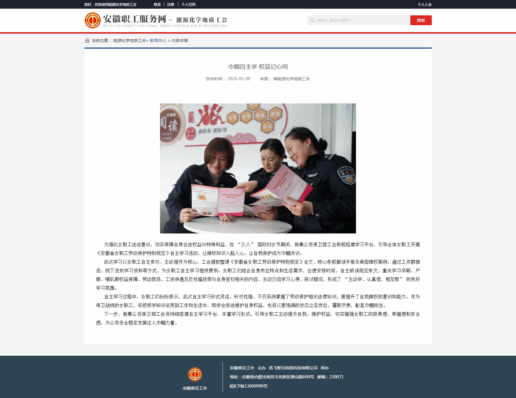 为强化女职工法治意识,切实保障自身合法权益与特殊利益,在 “三八” 国际妇女节期间,新集公司保卫部工会积极搭建学习平台,引导全体女职工开展《安徽省女职工劳动保护特别规定》自主学习活动,让维权知识入脑入心,让自我保护成为巾帼共识。